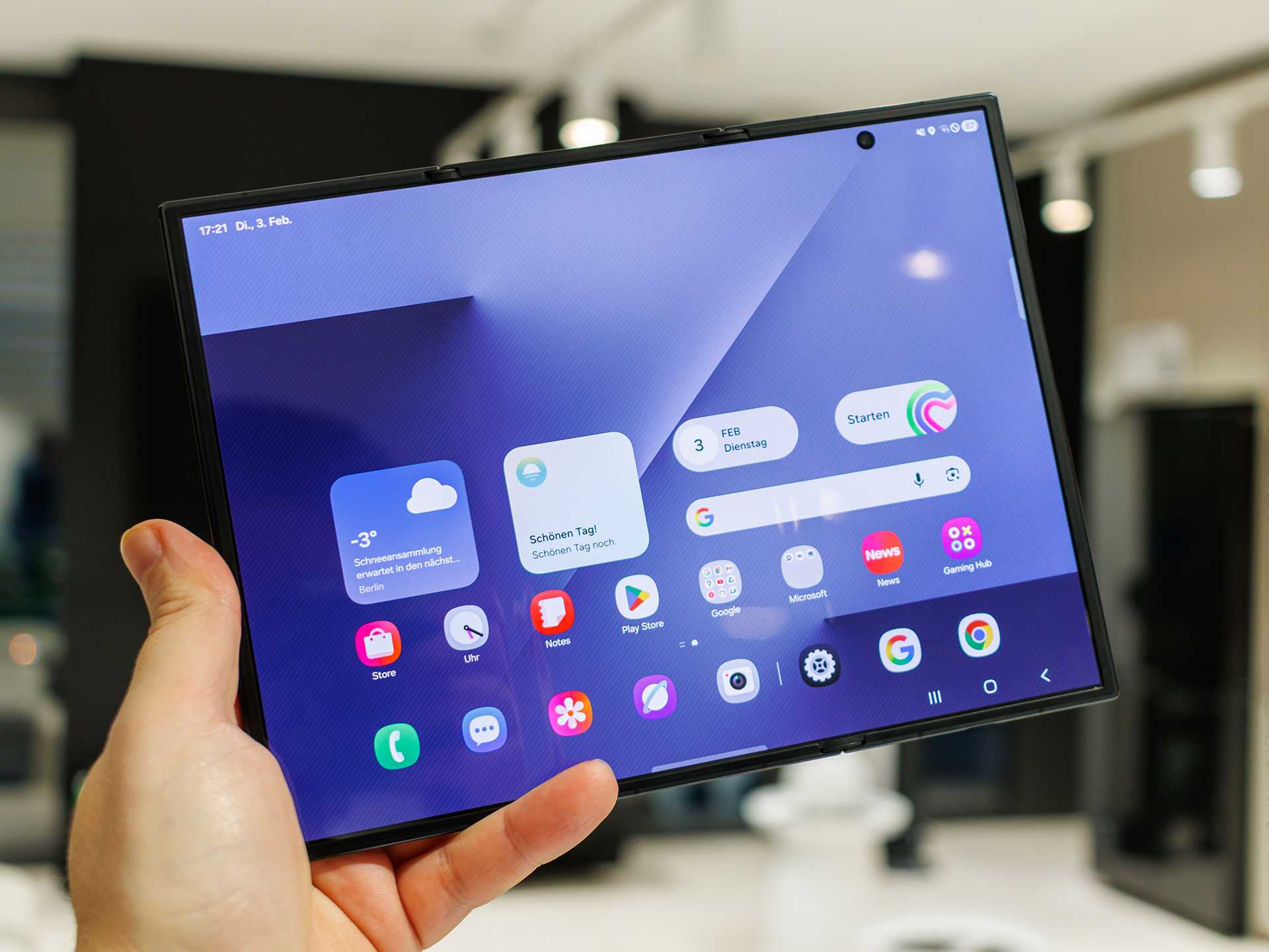 En la parte trasera, Samsung ha instalado un sistema de triple cámara con una cámara principal de alta resolución, un ultra gran angular y un teleobjetivo, que sobre el papel puede competir en la clase premium y se beneficia del factor de forma Flex, por ejemplo para disparar con las manos libres o para perspectivas creativas cuando el dispositivo está entreabierto y sirve de trípode. Además, hay varias cámaras frontales para videochats y selfies, que, en combinación con la gran pantalla interna, pueden resultar especialmente interesantes para reuniones productivas o la creación de contenidos. El diseño con dos bisagras, elementos de titanio y cristal reforzado pretende proporcionar una mayor robustez a pesar de la compleja mecánica, pero naturalmente sigue siendo más sensible que un monobloque clásico.