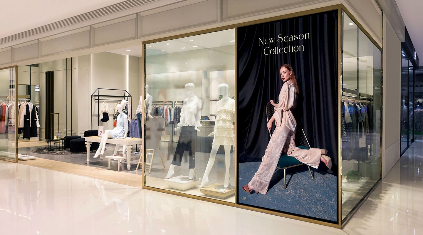 La pantalla tiene una diagonal de 115 pulgadas y utiliza un panel VA con una resolución de 3.840 x 2.160. Una diagonal de pantalla tan grande daría lugar a una pixelación visible en resoluciones inferiores. Se especifica un brillo típico de 1.000 cd/m², especialmente relevante para la visualización en entornos más luminosos. El tiempo de respuesta se especifica en 6,5 milisegundos, aunque esto no es tan relevante para la publicidad.
