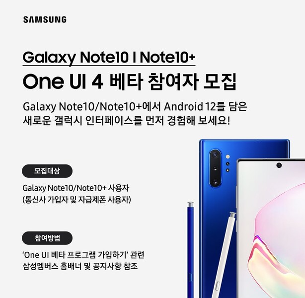 Ahora, Samsung ha llevado las versiones beta de su nuevo sistema operativo a sus antiguos buques insignia. One UI 4 Beta está actualmente disponible en Corea del Sur para los dispositivos desbloqueados y los adquiridos en KT Corporation, antes Korea Telecom. Como muestra la imagen de abajo, sólo el Galaxy Note 10 y Galaxy Note 10 Plus son elegibles, en lugar del Galaxy Note 10 Litetambién.
