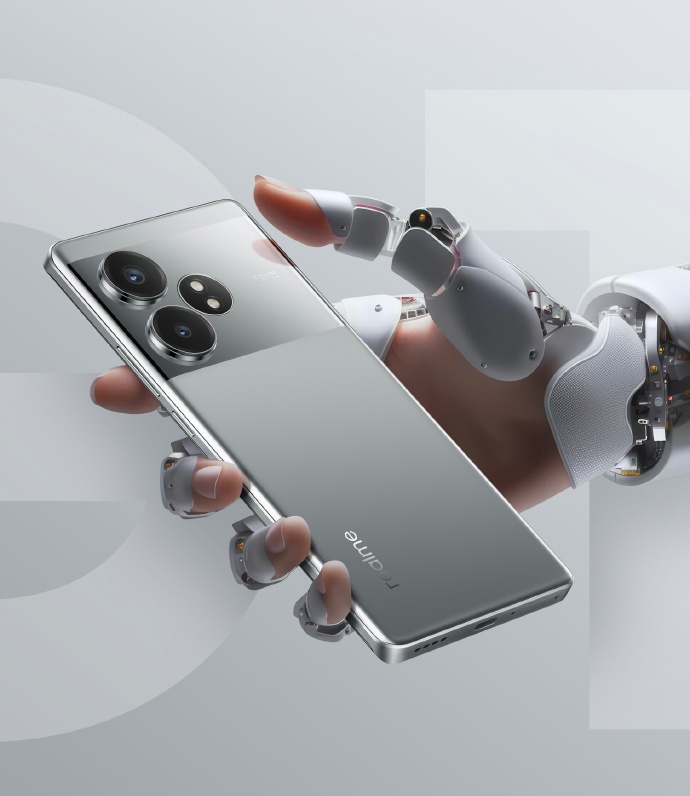 El típico Realme GT 'cristal de ventana' envolvente se desvanece literalmente en el fondo en esta iteración, mezclándose con un panel trasero de una textura que, a pesar de sus mejoras reportadas, parece resbaladizo incluso en el agarre del ciborg modelo de mano visto en la nueva imagen promocional filtrada de Digital Chat Station.