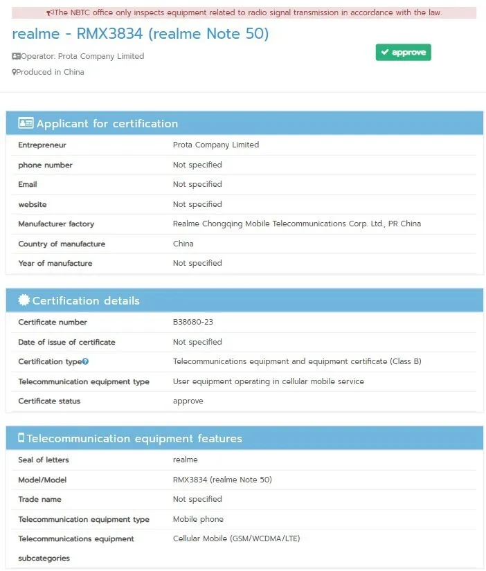 El RMX3834 de Realme también tiene 4 GB de RAM y ejecuta Android 13. Su existencia también acaba de ser validada por el NBTCque lo ha registrado como teléfono inteligente smartphone llamado Note 50. No obstante, su supuestamente inminente lanzamiento en Filipinas podría ayudar a explicar los planes del OEM para su nueva serie.