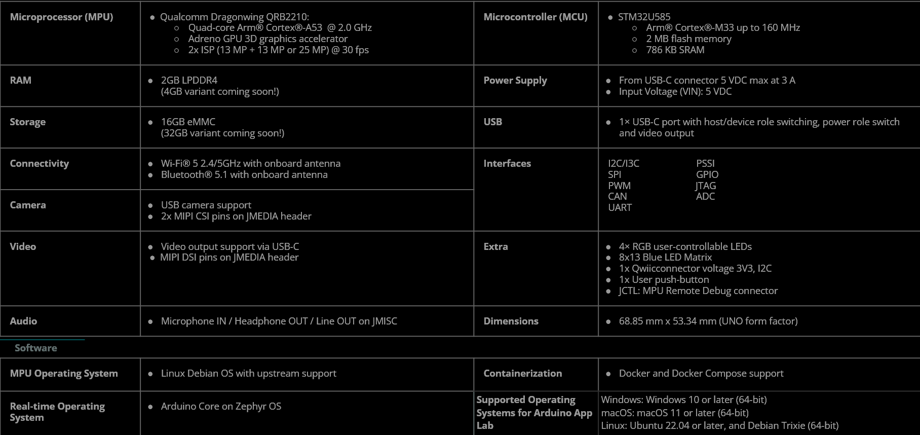 Inicialmente, el Arduino UNO Q se lanzará con 2 GB de RAM y 32 GB de almacenamiento eMMC. Pronto llegará una variante con 4 GB de RAM y 64 GB de almacenamiento. Por defecto, el puerto USB-C puede hacer las veces de entrada de cámara y salida de vídeo, pero también se pueden utilizar clavijas dedicadas para liberar el puerto. Por otro lado, los micrófonos siempre necesitarán utilizar un pin.