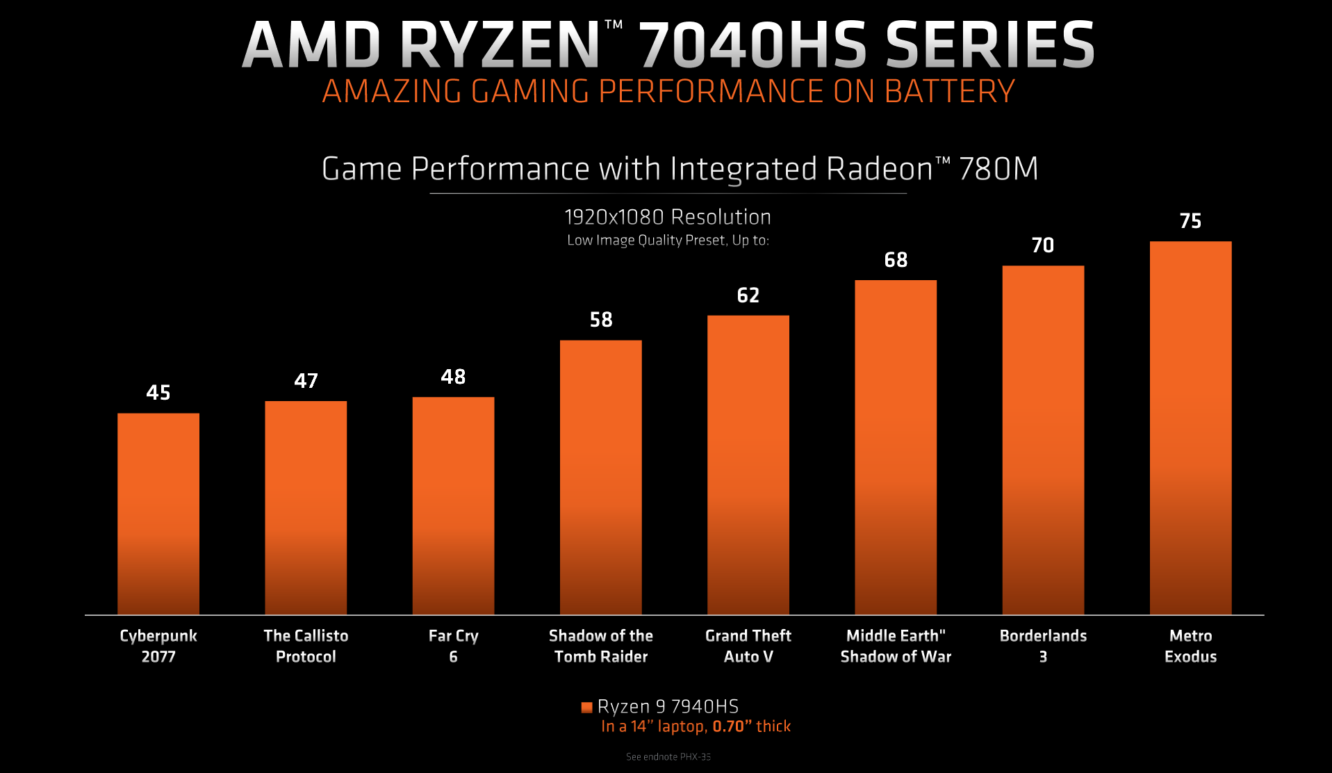 Por ahora, la gama Ryzen 7040HS cuenta con tres modelos, el buque insignia Ryzen 9 7940HS (8c, 16t, 24 MB de caché, 5,2/4,0 GHz), Ryzen 7 7840HS (8c, 16t, 24 MB de caché, 5,1/3,8 GHz) y Ryzen 5 7540HS (6c, 12t, 24 MB de caché, 5,0/4,3 GHz ). Dependiendo del modelo, se obtendrá una iGPU Radeon 780M basada en RDNA 3 (Ryzen 9 7940HS/Ryzen 7 7840HS) o Radeon 760M (Ryzen 5 7640HS). La primera es de 12 núcleos con un boost clock de 2,8 GHz, mientras que la segunda se reduce a 8 núcleos y 2,6 GHz.