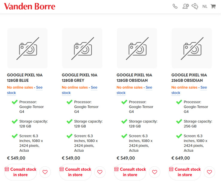 No sólo eso, sino que Vanden Borre también ha revelado el precio de lanzamiento. Actualmente, el minorista espera vender el Pixel 10a en colores azul, gris y obsidiana. Como muestra la captura de pantalla inferior, Vanden Borre ha fijado el precio de estos colores en 549 euros (~650 dólares) con 128 GB de almacenamiento. El minorista confirma que Google cobrará 649 euros (~769 dólares) por 256 GB de almacenamiento. Sin embargo, el Pixel 10a debería estar disponible con 256 GB de almacenamiento en más colores que el acabado Obsidian que se muestra a continuación.
