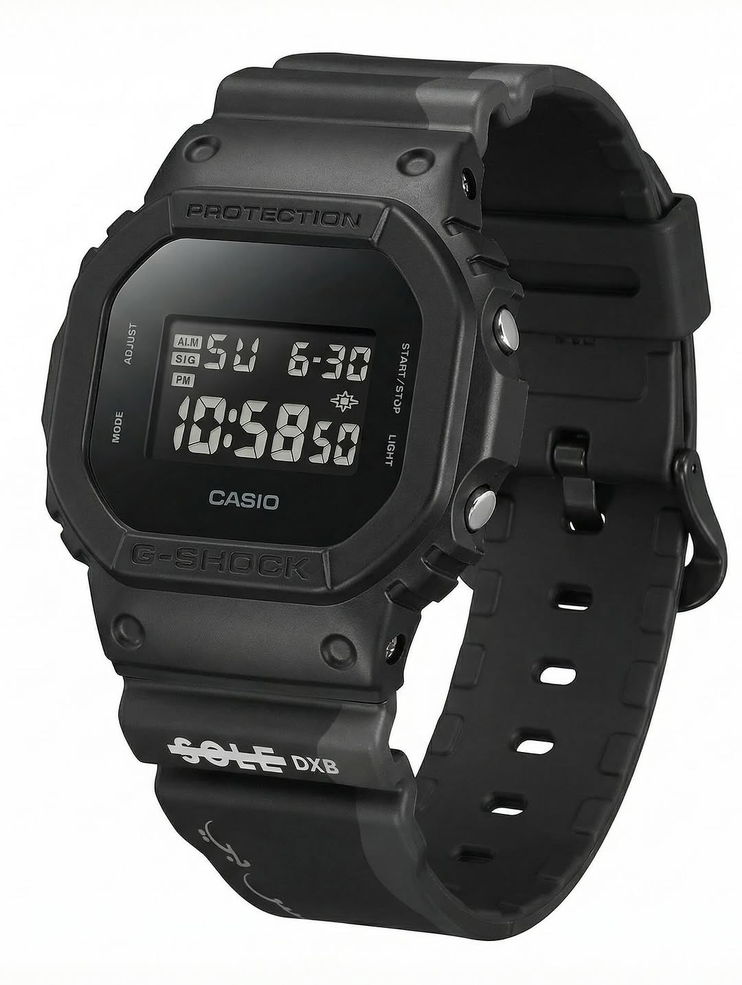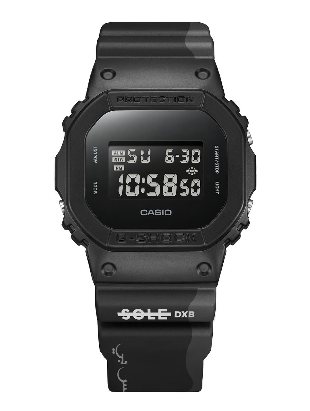 La colaboración utiliza la caja digital cuadrada de G-Shock. Por las imágenes del producto, el reloj presenta una caja y una correa de resina negra mate, junto a una pantalla digital oscura y de bajo contraste. El bisel lleva las marcas estándar "Protection" y "G-Shock", mientras que la correa lleva el texto "Sole DXB", con escritura árabe estilizada impresa a lo largo de la sección inferior de la correa.