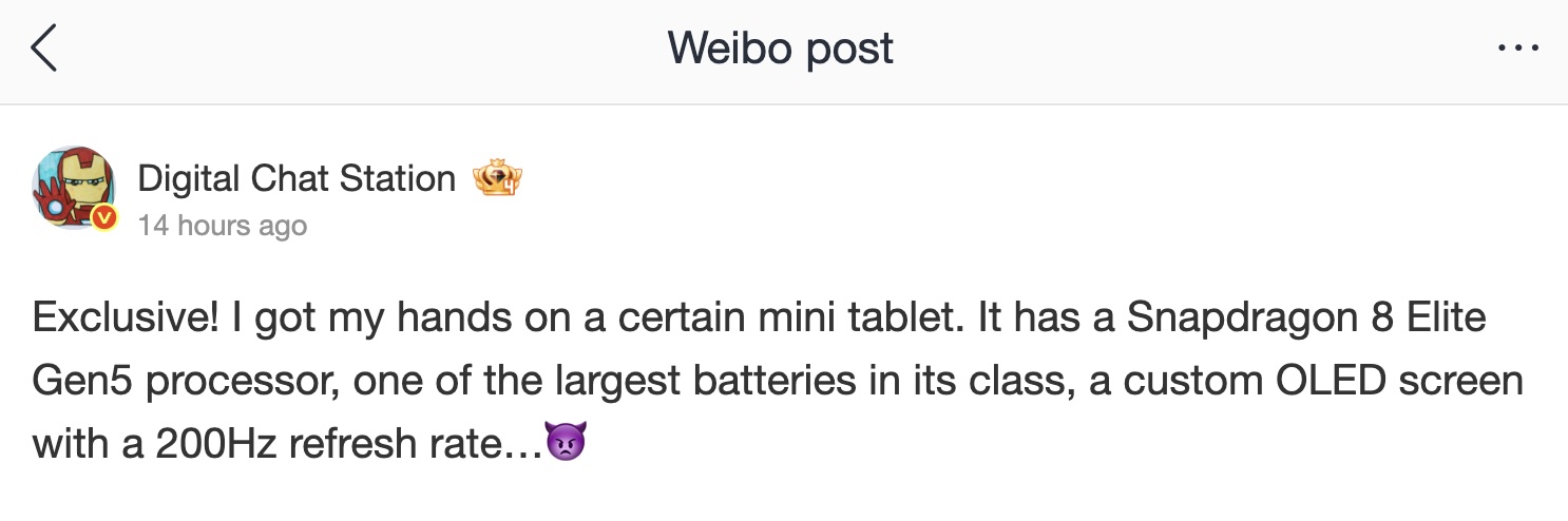 Por último, Digital Chat Station mencionó que la tableta para juegos lucirá una batería de 9.000 mAh. Aunque eso pueda parecer mucho, el potente SoC emparejado con una pantalla OLED de 200 Hz definitivamente se comerá el rendimiento de la duración de su batería. Como ocurre con todos los rumores previos al lanzamiento, se aconseja a los lectores que acepten esta información con bastante escepticismo.