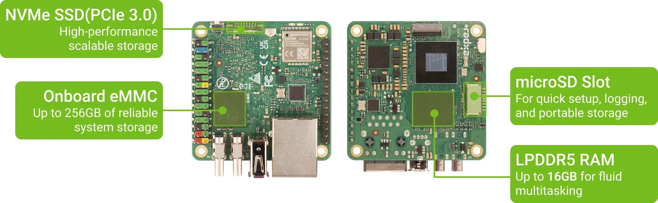 La alimentación también se suministra a través de USB-C, y también es compatible con USB 2.0 y USB OPT. Además, dispone de un total de 45 cabezales GPIO, y la placa de 51 x 51 mm incorpora un conector FPC con interfaz PCIe 3.0 (un carril), que permite la conexión de unidades SSD NVMe