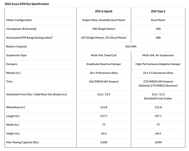 Acura ha relanzado el distintivo ZDX, que retiró hace más de una década, con la presentación del nuevo Acura ZDX A-Spec y el deportivo ZDX Type S. En el acabado ZDX A-Spec, con su configuración de un solo motor de 340 CV, puede ofrecer una autonomía de hasta 325 millas, que sólo desciende ligeramente a 315 millas en el acabado de doble motor ZDX Type S, con su potencia combinada más potente de 500 CV. El Acura ZDX admite velocidades de carga de hasta 190 kW CC con una batería de iones de litio de 102 kWh de capacidad.