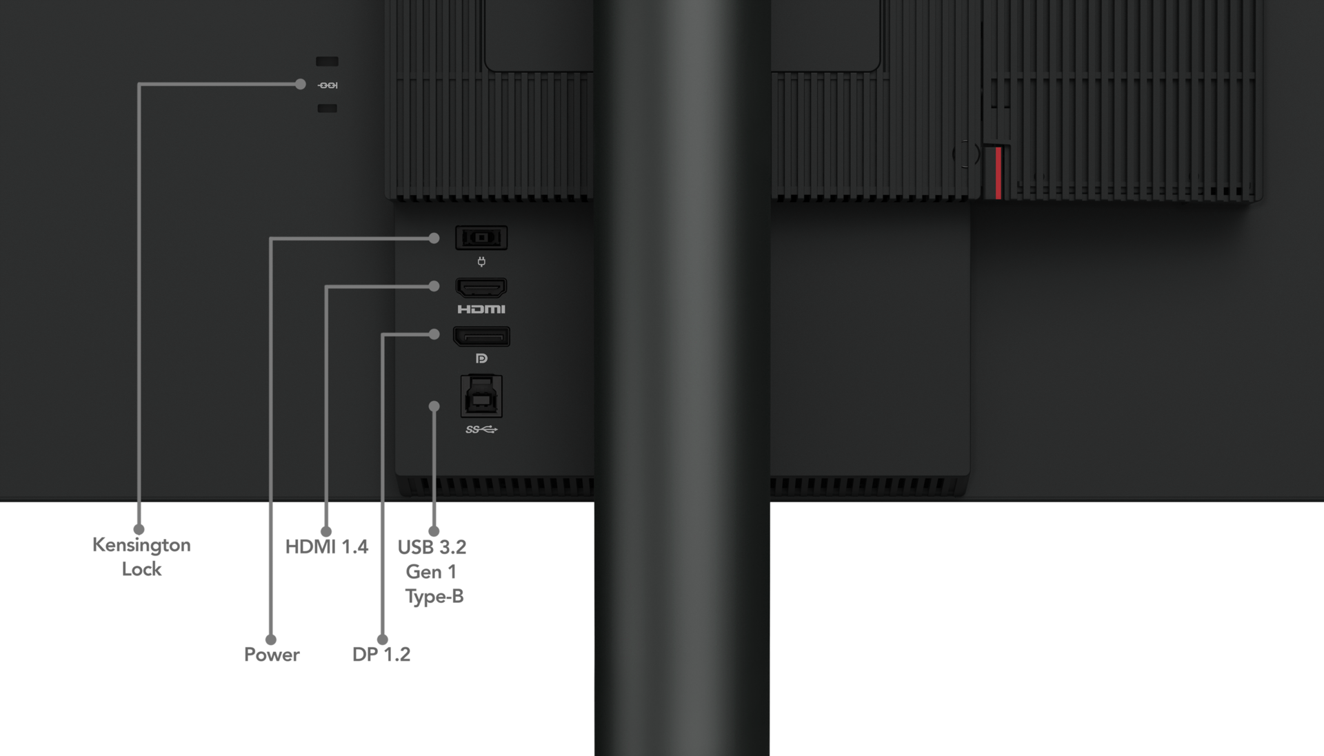 En cuanto a conectividad, el ThinkCentre Tiny-in-One (TIO) Gen 5 incluye un puerto HDMI 1.4, un puerto DP 1.4, dos puertos USB 3.2 Gen1 Tipo-A y un puerto USB 3.2 Gen1 Tipo-B. Además, en la parte superior de la pantalla hay una webcam integrada de 1080p. En la parte trasera hay dos ranuras de bloqueo Kensington y un botón de navegación que se inspira en el icónico punto de seguimiento de ThinkPad. También se incluyen dos altavoces inferiores de 3 vatios en la parte inferior de la pantalla.
