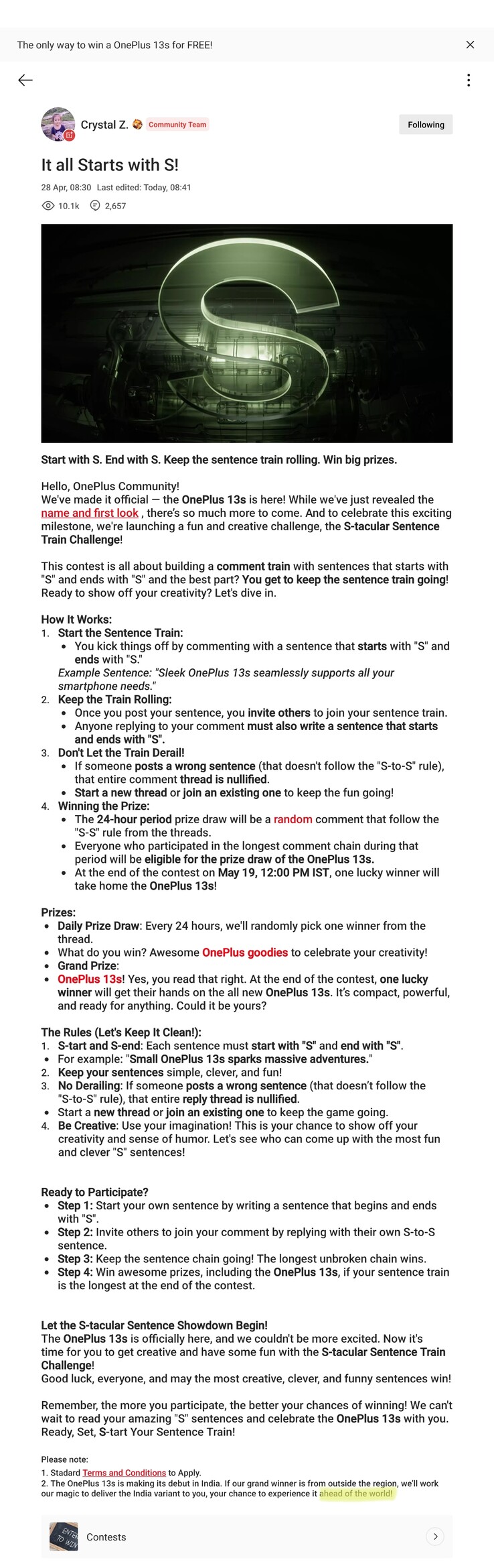 "Todo empieza con S" es un nuevo concurso"divertido y creativo" de elaboración de frases que empiecen y terminen con la letra S y su publicación en el sitio web OnePlus Community página web. Al hacerlo se pueden ganar premios: el 13s incluidos.