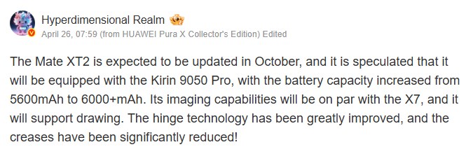 Según la filtración, el Mate XT2 estará alimentado por el chip Kirin 9050 Pro. Además, aunque los detalles sobre la pantalla son aún limitados, el informante afirma que Huawei ha introducido importantes mejoras en la tecnología de bisagra. Esto no sólo mejorará la durabilidad del mecanismo de plegado, sino que también reducirá el pliegue visible, que es una de las mayores preocupaciones con los teléfonos plegables. A filtración anterior también sugería que el dispositivo podría utilizar cristal ultraflexible avanzado.