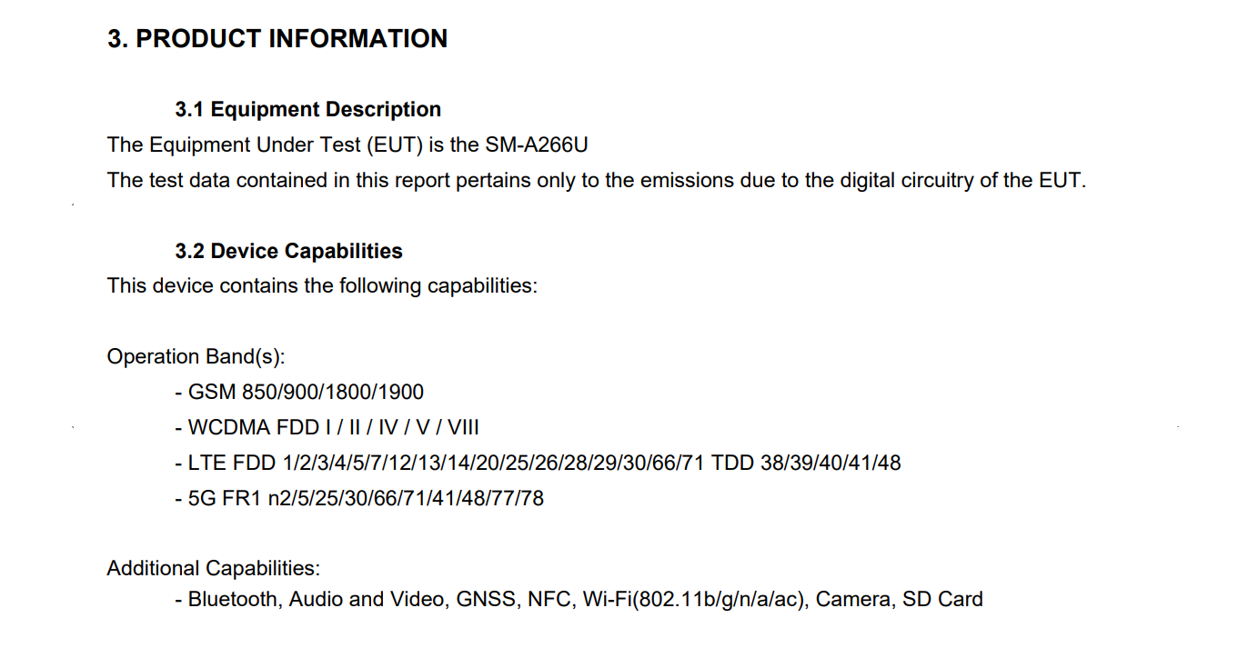 Sorprendentemente, hasta la fecha se sabe poco sobre las características internas del dispositivo (en comparación con el rumoreado A36 y A56 5G, es decir), aunque un listado de la FCC de https://fcc.io/A3LSMA266U asociado al mismo número de modelo parece confirmar que soportará Wi-Fi 5 además de Bluetooth, NFC y la velocidad de carga de 25 W impartida por el Samsung EP-TA800 de Samsung.