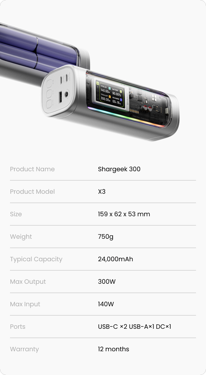 En cuanto al diseño, el Sharge 300 cuenta con un panel transparente en la parte frontal, a juego con la estética de algunos de los otros productos que ofrece la marca. Hay una tira RGB que rodea el panel, y Shargeek dice que las luces son personalizables. La parte frontal también tiene una pantalla que puede mostrar algo más que el estado de carga del núcleo.