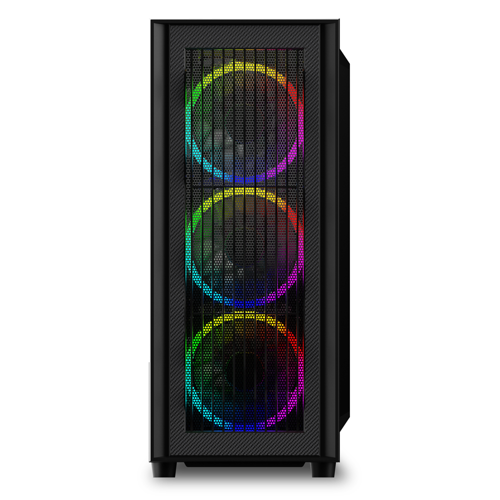 En el centro del concepto de diseño de la RGB Wave está el panel frontal. Tiene una serie de tiras onduladas en forma de onda delante de una malla permeable al aire y dentro de un marco con textura de fibra de carbono. Se complementa con un panel lateral de vidrio templado, a través del cual se puede admirar el hardware incorporado. Para redondear visualmente las cosas, detrás del panel frontal se han instalado tres ventiladores de 120 milímetros con iluminación RGB direccionable para acentuar el diseño ondulado y el hardware instalado con hasta 16,3 millones de colores.