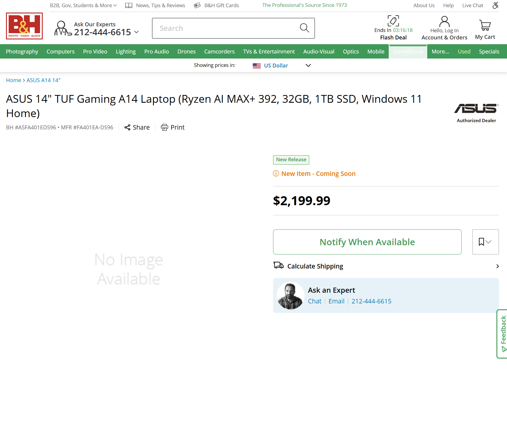 Sin embargo, parece que eso podría cambiar pronto para la variante FA401EA basada en el Strix Halo de Asus. Anteriormente, Asus había listado el portátil en su sitio web estadounidense. Ahora, Best Buy, B&H Photo Video y Provantage han seguido su ejemplo. Señalado como "nuevo lanzamiento", B&H Photo Video afirma que el FA401EA "llegará pronto" e incluye un botón de registro para recibir una notificación cuando se abran los pedidos anticipados. Mientras tanto, Provantage advierte de que el FA401EA está agotado cuando se intenta realizar un pedido.