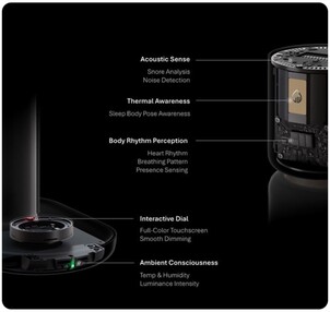 El dial de la base permite encender o atenuar la lámpara en cualquier momento. Sin embargo, en la parte superior de la lámpara hay varios sensores, entre ellos un micrófono, que se utiliza para detectar y analizar los ronquidos, entre otras cosas. Un termómetro y un sensor de humedad están diseñados para evaluar las condiciones ambientales que pueden afectar al sueño. Por último, un radar de ondas milimétricas está diseñado para detectar no sólo los movimientos del cuerpo, sino incluso la frecuencia respiratoria mediante la evaluación de los movimientos del pecho