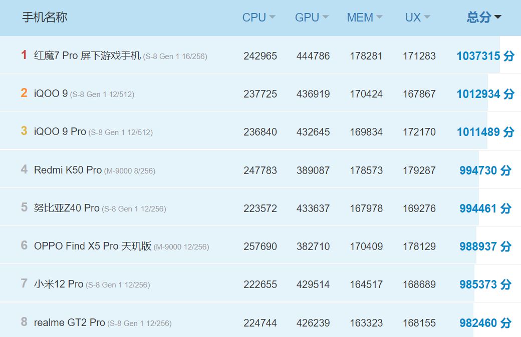 Se ha hablado mucho de cómo el MediaTek Dimensity 9000 supera al Snapdragon 8 Gen 1, al menos en el departamento de CPU. En general, sin embargo, parece que el Snapdragon 8 Gen 1 sigue encabezando las tablas de rendimiento de AnTuTu en China, a pesar de los resultados estelares del Redmi K50 Pro con Dimensity 9000 y del OPPO Find X5 Pro.