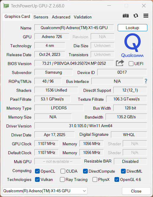 Lenovo IdeaPad Slim 3 15Q8X10 Qualcomm Snapdragon X X1-26-100 ⎘ Qualcomm SD X Adreno X1-45 1.7 TFLOPS ⎘ 16 GB Memoría, 256 GB SSD | Amazon: $689.00 Precio de catálogo: 710 Euro | 1.6 kg | 18.5 mm | 15.30" 1920x1200 148 PPI IPS LED | |