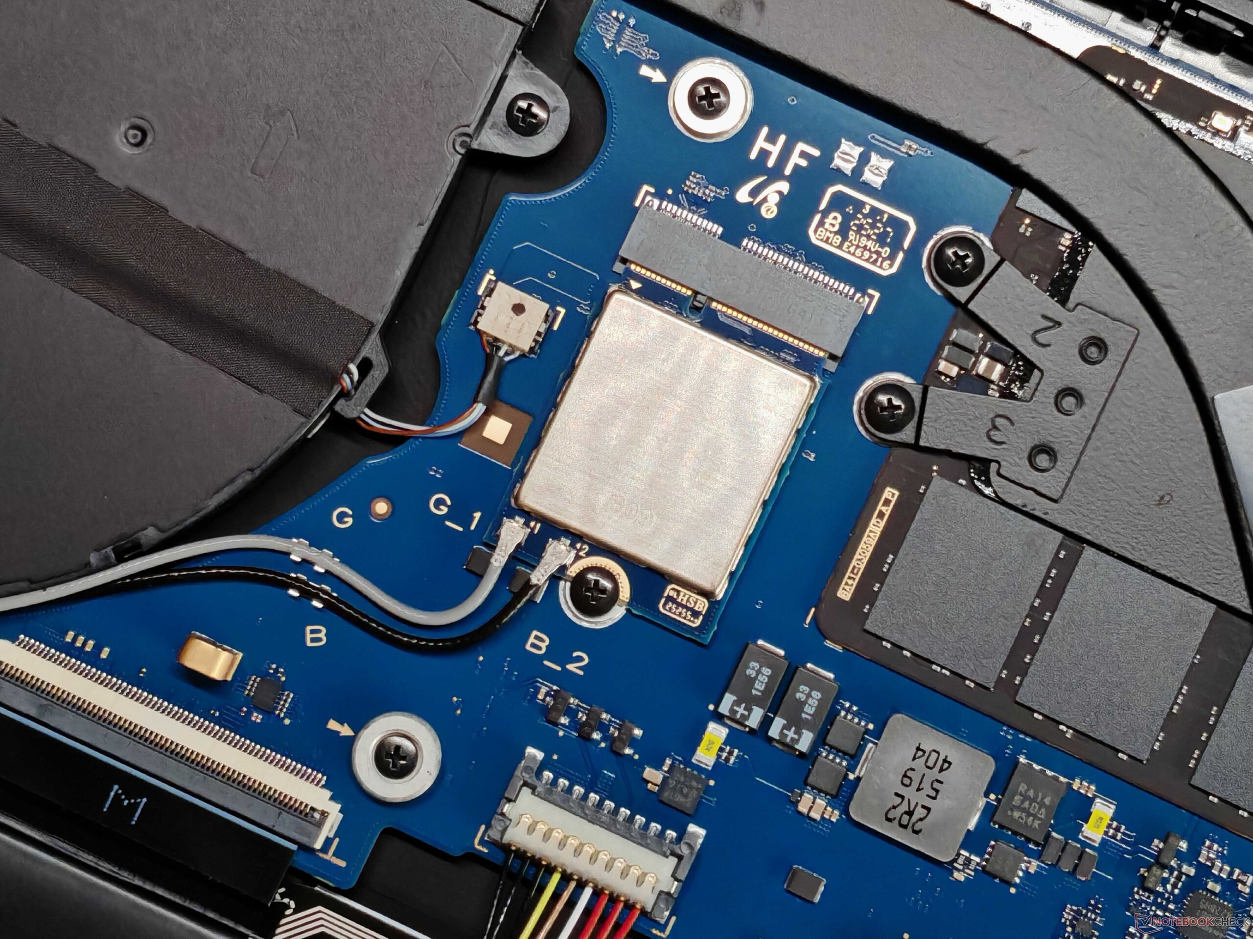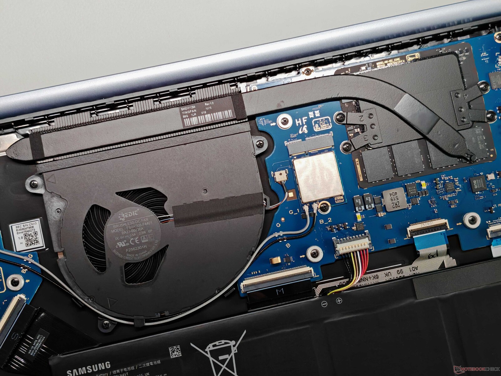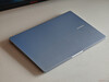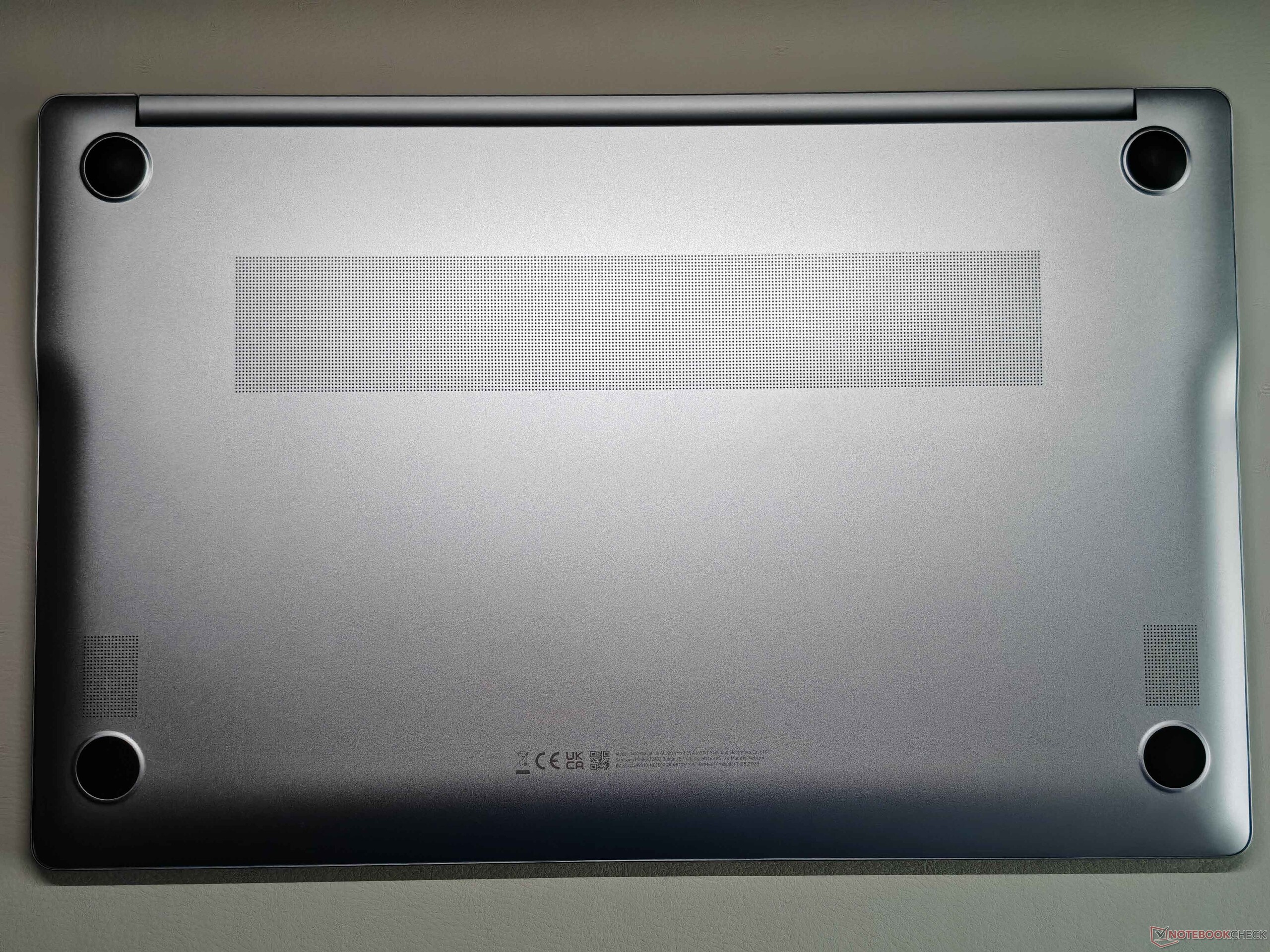 Samsung utiliza una delgada carcasa metálica para el Galaxy Book4 Edge, que tiene 1,5 cm de grosor y pesa 1,49 kg, lo que hace que quepa fácilmente en cualquier mochila. El color de la carcasa es azul zafiro, que es un tono muy claro de azul (más bien plateado con un ligero tinte azul). Visualmente, el portátil tiene un aspecto estupendo, y la calidad también es buena. Sólo la bisagra de la pantalla (ángulo máximo de apertura de 180 grados) es un poco demasiado suave y, por tanto, se tambalea un poco. La cubierta de la carcasa inferior puede retirarse (tornillos bajo las patas de goma), pero las opciones de mantenimiento se limitan a la limpieza del ventilador, el módulo WLAN y la batería, que puede sustituirse en caso necesario.