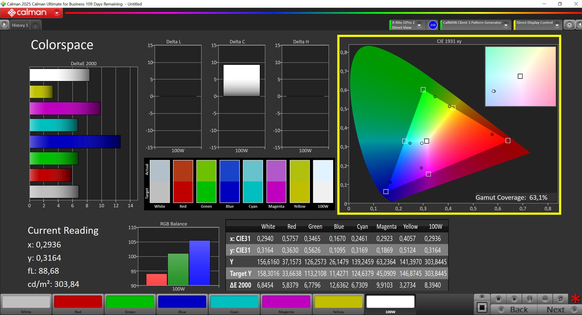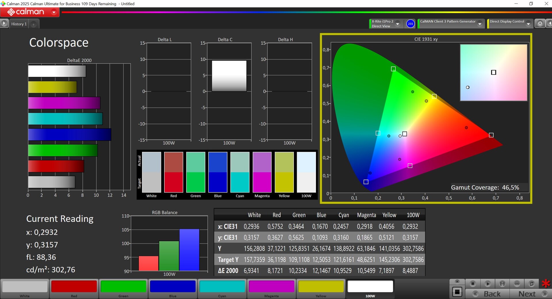 El brillo es de 300 cd/m2 y el valor de negro es de unos buenos 0,26 cd/m2, por lo que el contraste sigue siendo de un razonable ∼1.200:1. Esto es suficiente para el uso en interiores, pero difícilmente se puede trabajar cómodamente en entornos muy luminosos o al aire libre. La cobertura del espacio de color es muy baja y el perfil de fábrica tampoco es especialmente preciso. Además de un claro tinte azul y una temperatura de color demasiado fría, también hay desviaciones de color significativas. El panel no es adecuado para la edición de imágenes.