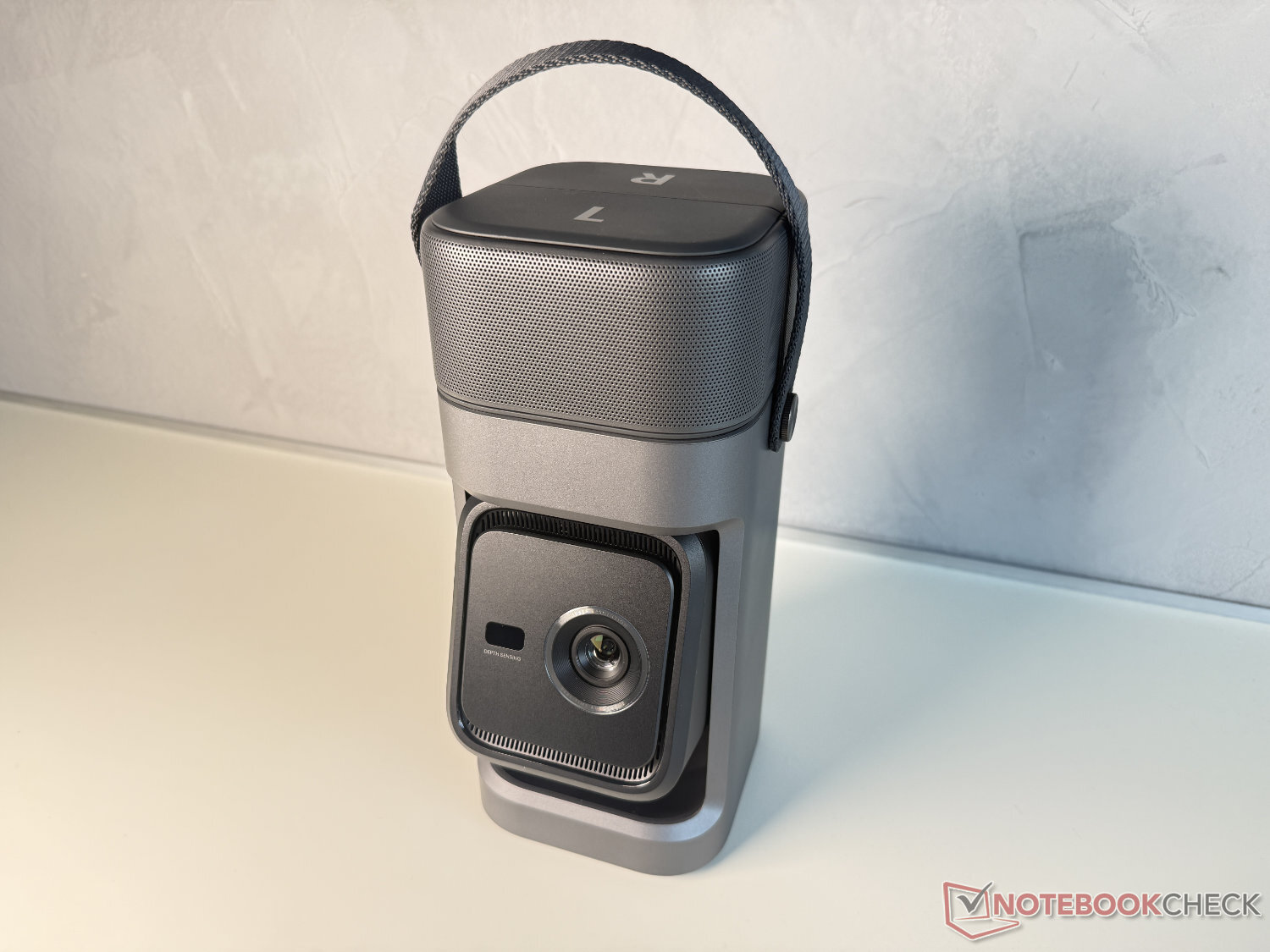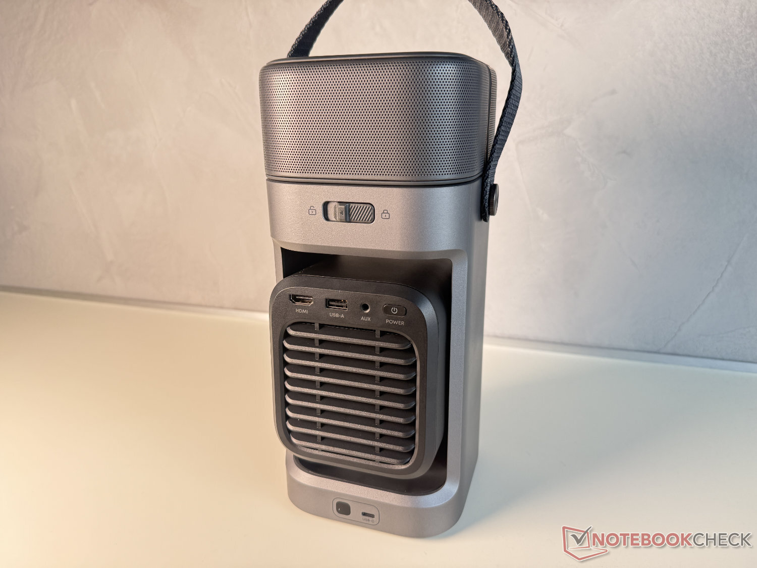 La unidad de proyección está girada en el modo de transporte y, por tanto, protegida. Antes de utilizarla, se gira fuera del aparato, que también sirve como cardán de 130 grados y permite una alineación flexible. La imagen se reproduce mediante un pequeño sensor DLP con fuente de luz LED que, según el fabricante, da como resultado una imagen Full HD brillante de 650 ANSI lumen (1.920 x 1.080 píxeles).