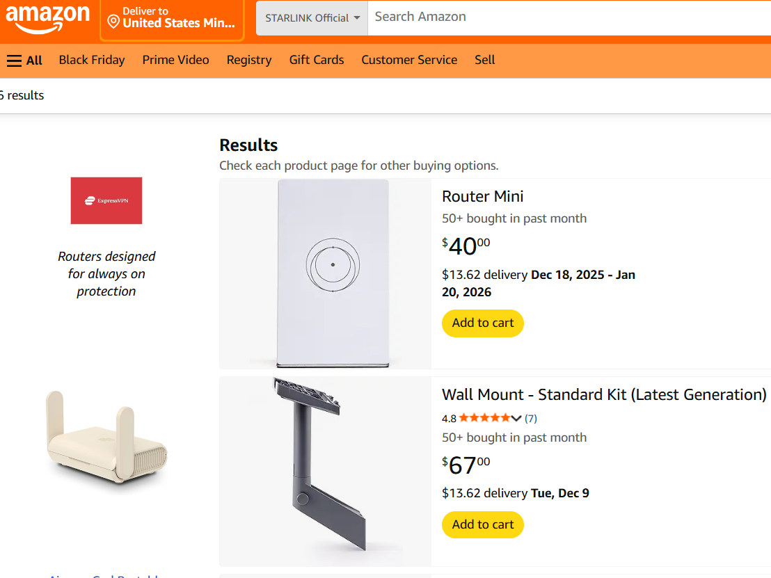 Los compradores pueden adquirir ahora accesorios específicos de Starlink, como el router Wi-Fi, directamente desde el sitio, con la mayoría de los artículos disponibles para entregas Prime al día siguiente o en un día. Un sitio de reseñas llamado DISHYTech detectó inicialmente la tienda Starlink de aspecto oficial a principios de este mes, señalando que parece operar a través de Virtual Supply. Este distribuidor externo con sede en Oregón vende una variedad de productos electrónicos de consumo a grandes minoristas y anteriormente vendía la antena parabólica Starlink estándar, lo que sugiere que podría ofrecerse más inventario con el tiempo.