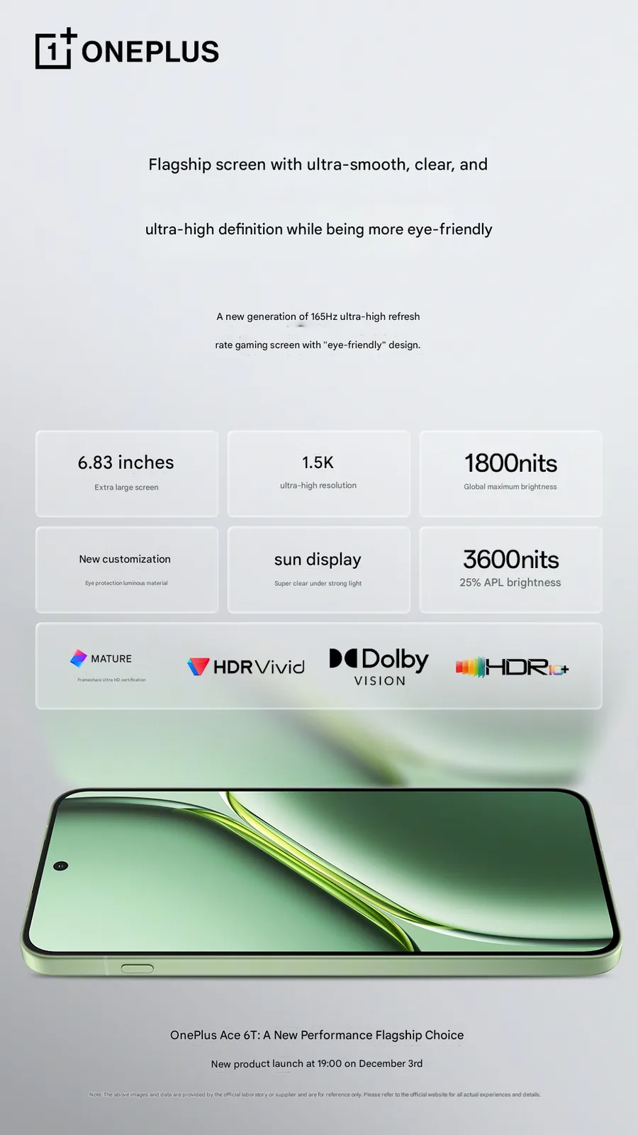 Además de compartirlos en el sitio global, OnePlus ha detallado la pantalla del Ace 6T a través de su cuenta china de Weibo. A través de un reciente teaser, la marca revela que la pantalla de 6,83 pulgadas y 165 Hz contará con un índice de "brillo máximo global" de 1.800 nits, compatibilidad con HDR10+ y vendrá con Dolby Vision.