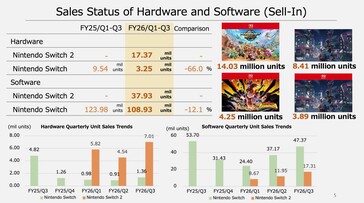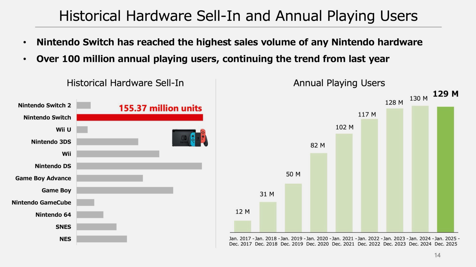 A pesar de ser una consola de última generación, la Switch original consiguió vender 3,25 millones de unidades, un 66% menos que en el mismo periodo del año anterior. Nintendo vendió un total de 146,9 millones de juegos, 37,93 millones de los cuales estaban optimizados específicamente para la Switch 2.
