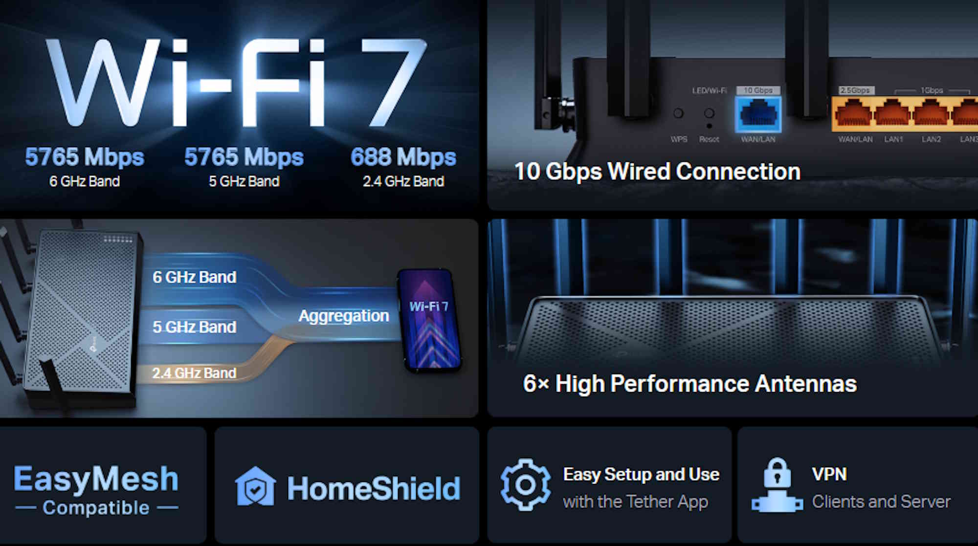 Según TP-Link, el Archer BE670 es adecuado para casas grandes con tres dormitorios. Para cubrir zonas más amplias y mejorar la velocidad inalámbrica, el router puede establecer una red en malla a través de EasyMesh. Se incluyen seis antenas externas claramente visibles, así como un total de cinco puertos Ethernet. Los puertos de 10 Gbps y 2,5 Gbps pueden utilizarse cada uno como puerto WAN o LAN.