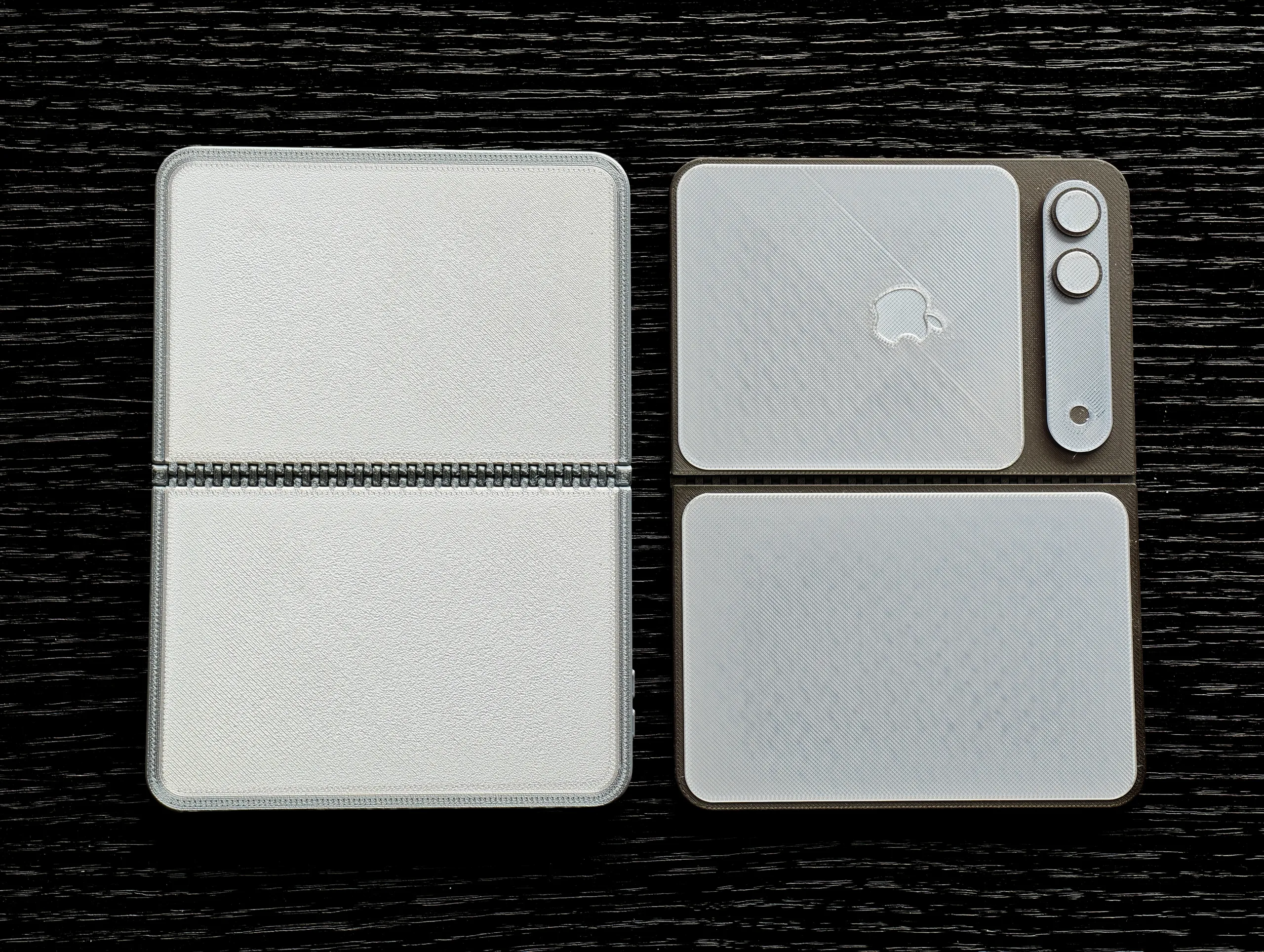Tras las diversas imágenes renderizadas, el filtrador chino Digital Chat Station acaba de publicar en https://www.weibo.com/6048569942/Qo971kdBf imágenes directas de unos primeros modelos ficticios, que pretenden dar una idea mucho más concreta del formato inusual y comparativamente muy compacto del primer plegable de Apple. Según la información disponible hasta ahora, se trata de un iPhone muy compacto, de aspecto más bien cuadrado cuando está plegado, con una pantalla de 5,3 pulgadas de cubierta. El modelos CAD filtrados miden 120,6 x 83,8 x 9,6 mm, lo que lo hace más pequeño en altura que el último mini-iPhone de Apple, el iPhone 13 Minipero, naturalmente, ligeramente mayor en anchura y grosor.