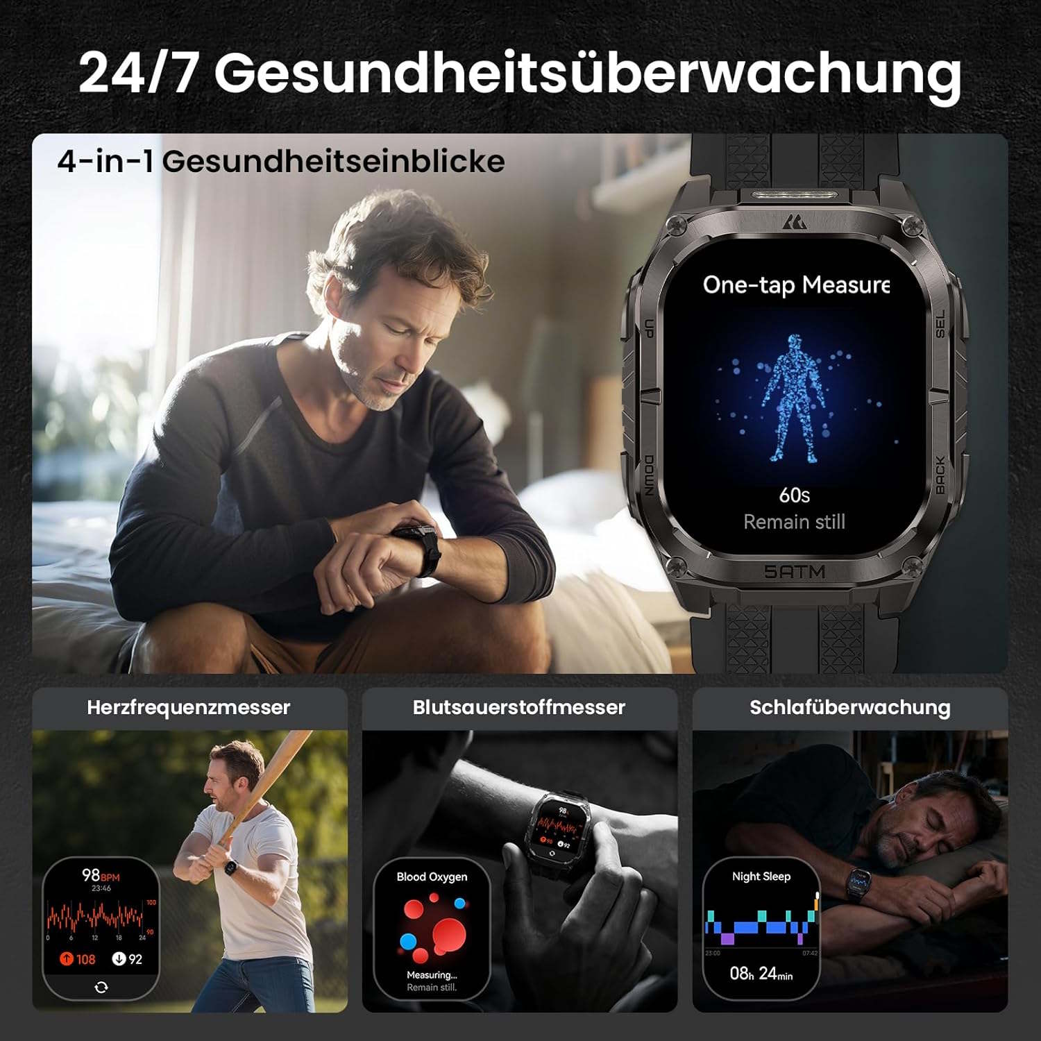 Cuando un smartphone está emparejado, las notificaciones pueden mostrarse en el smartwatch. El Tank M4C también puede funcionar como dispositivo manos libres Bluetooth, por lo que no es necesario descolgar el teléfono al responder una llamada. Los LED para la función de linterna se encuentran en la parte superior y pueden ajustarse en varios niveles. Según Kospet, el reloj está fabricado con una cantidad relativamente grande de acero inoxidable y metales en general. Para ser más exactos, la propia caja del reloj está hecha de una aleación de zinc, mientras que para la parte trasera se utiliza plástico.