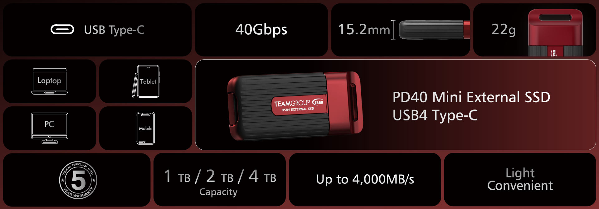 Team Group ha presentado una nueva unidad de almacenamiento portátil, la mini SSD externa PD40. Viene con conectividad USB4, pero también es compatible con dispositivos USB 3.2 y USB 2.0. No obstante, con el puerto Type-C más rápido, la empresa afirma que puede ofrecer velocidades de lectura de hasta 4.000 MB/s.
