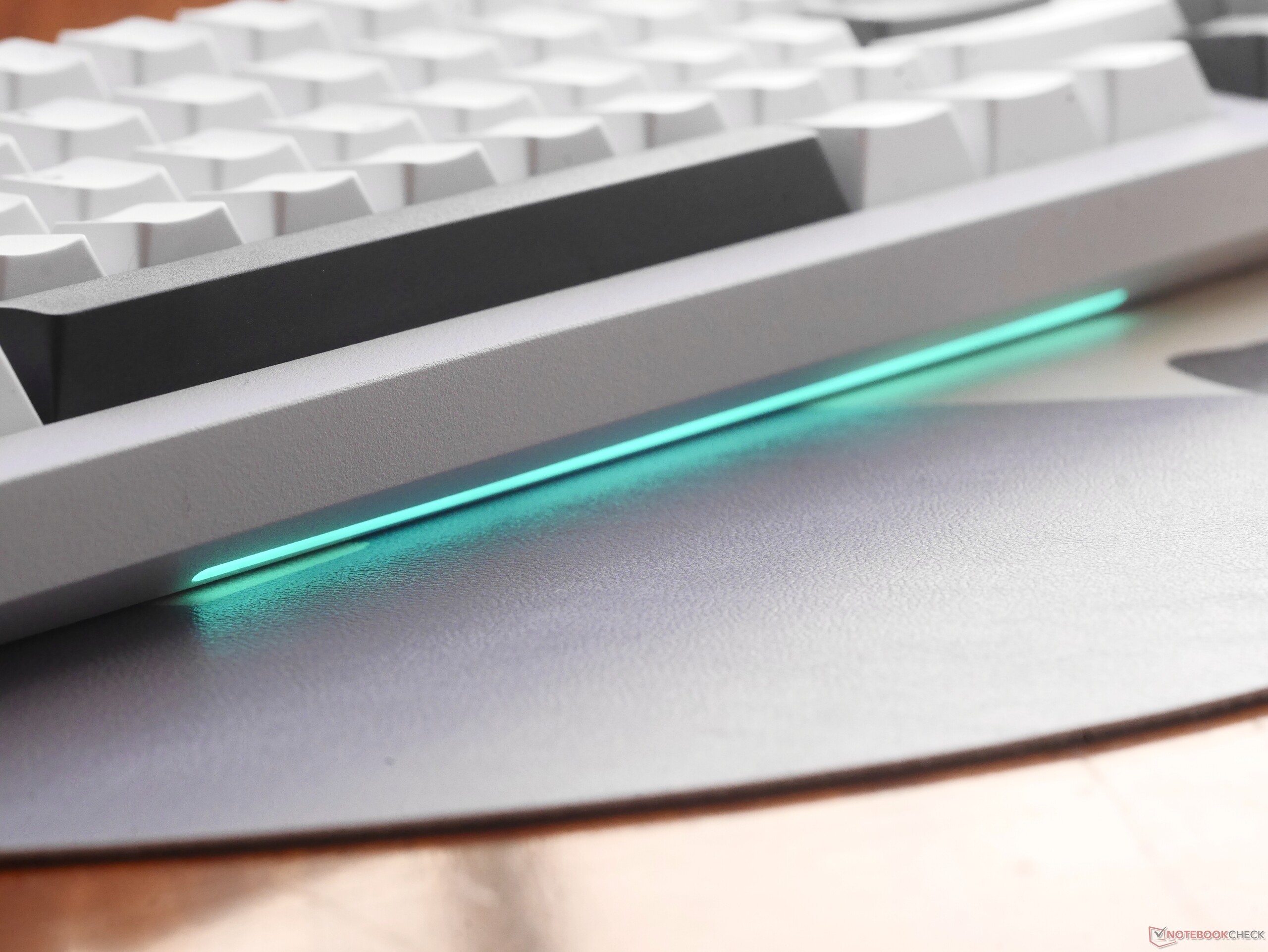 Aunque el uso de teclas de perfil Cherry tiene sus ventajas, y la iluminación de acento RGB le da al teclado un aspecto de ciencia ficción espacial, sigue pareciendo un poco menos especial que el Galaxy 100. No obstante, los gruesos biseles del Galaxy68 le dan presencia en su escritorio, y las esquinas redondeadas lo diferencian de otros teclados mecánicos similares. Esos gruesos biseles y la disposición única del 65% también significan que el Galaxy68 es casi tan ancho como un TKL medio, unos 6,5 mm más estrecho que el Keychron C1 Pro 8K que revisamos recientemente.
