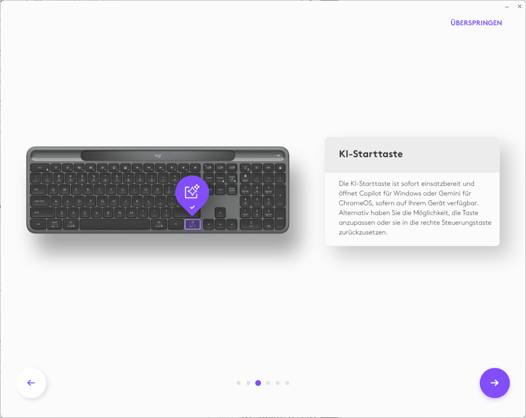La disposición de las teclas es estándar y, por lo tanto, resulta inmediatamente familiar para la mayoría de los usuarios, pero Logitech ha añadido una tecla AI adicional y teclas de control adicionales para reuniones en línea. Muchas de las teclas también se pueden personalizar o asignar a acciones inteligentes.