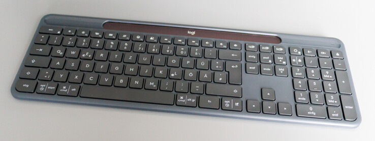 Logitech Signature Slim Solar+ es un teclado de diseño minimalista y moderno que destaca por sus reducidas dimensiones y su peso relativamente ligero. Sólo mide unos 20 mm de alto y pesa 700 gramos. La carcasa está fabricada principalmente con plástico reciclado, lo que no sólo contribuye a la sostenibilidad, sino que también le confiere un agradable acabado mate. Las teclas son planas y ofrecen una experiencia de tecleo agradable y bastante silenciosa, adecuada para entornos de oficina. Sin embargo, no es en absoluto silencioso, como afirma Logitech en su sitio Web. Por el momento, el teclado sólo está disponible en color grafito.