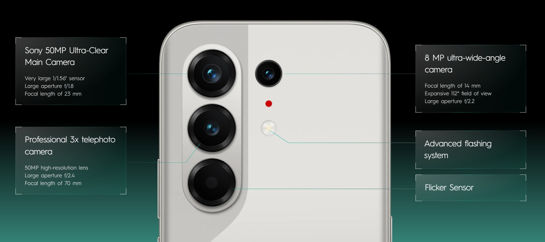 Dispone de varias funciones de cámara, como un modo de superzoom AI 60x (sólo en el modelo pro), modo de foto en directo e incluso un modo acuático que permite a los usuarios grabar vídeos a una profundidad de hasta 2 metros. El teléfono también viene con funciones de edición de fotos AI que incluyen un supresor de reflejos, un eliminador de reflejos, un eliminador de sombras y una función que convierte las imágenes estáticas en 3D.