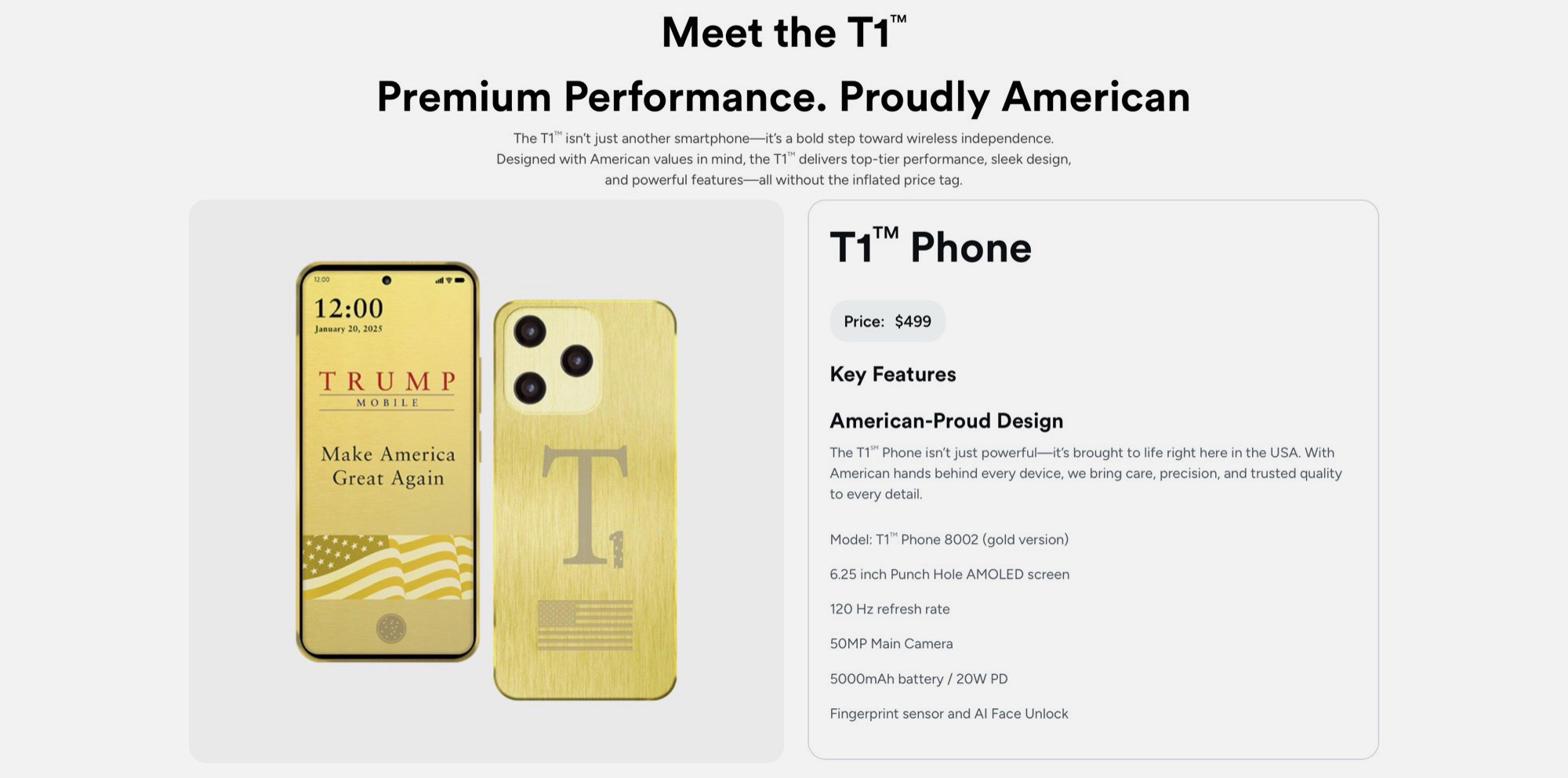 El teléfono Trump T1 fue presentado a mediados de junio de 2025. Con un precio de 499 dólares, este teléfono inteligente de gama media ofrece unas especificaciones más acordes con dispositivos de gama básica mucho más baratos. Los pedidos anticipados comenzaron poco después de su anuncio, exigiendo a los primeros compradores el pago de un depósito de 100 dólares. Apenas dos semanas después de su debut, Trump Mobile ya había cambiado sus especificaciones y confirmó que no es "Made in USA" como se anunció en un principio.