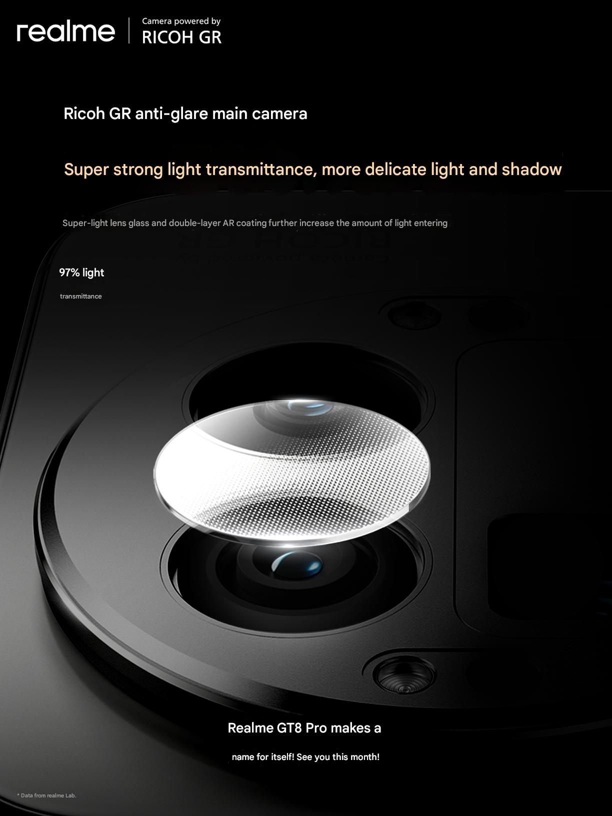 Es probable que la cámara principal de la Realme GT8 Pro conserve un objetivo de 23 mm, al tiempo que ofrece la opción de cambiar a 28 mm o 40 mm (introducido en la Ricoh GR IIIx) a través de la aplicación de la cámara. Estas dos distancias focales son especialmente adecuadas para la fotografía callejera, un área en la que la Ricoh GR tradicionalmente tiene una gran autoridad. También se incluirá un modo de visor. En los teasers oficiales compartidos recientemente en Weibo y X, Realme reveló que la GT8 Pro está equipada con una lente "antirreflejos" -similar al revestimiento Zeiss T* que se encuentra en los buques insignia de Vivo- para reducir artefactos no deseados como los reflejos y ofrecer instantáneas detalladas y vibrantes