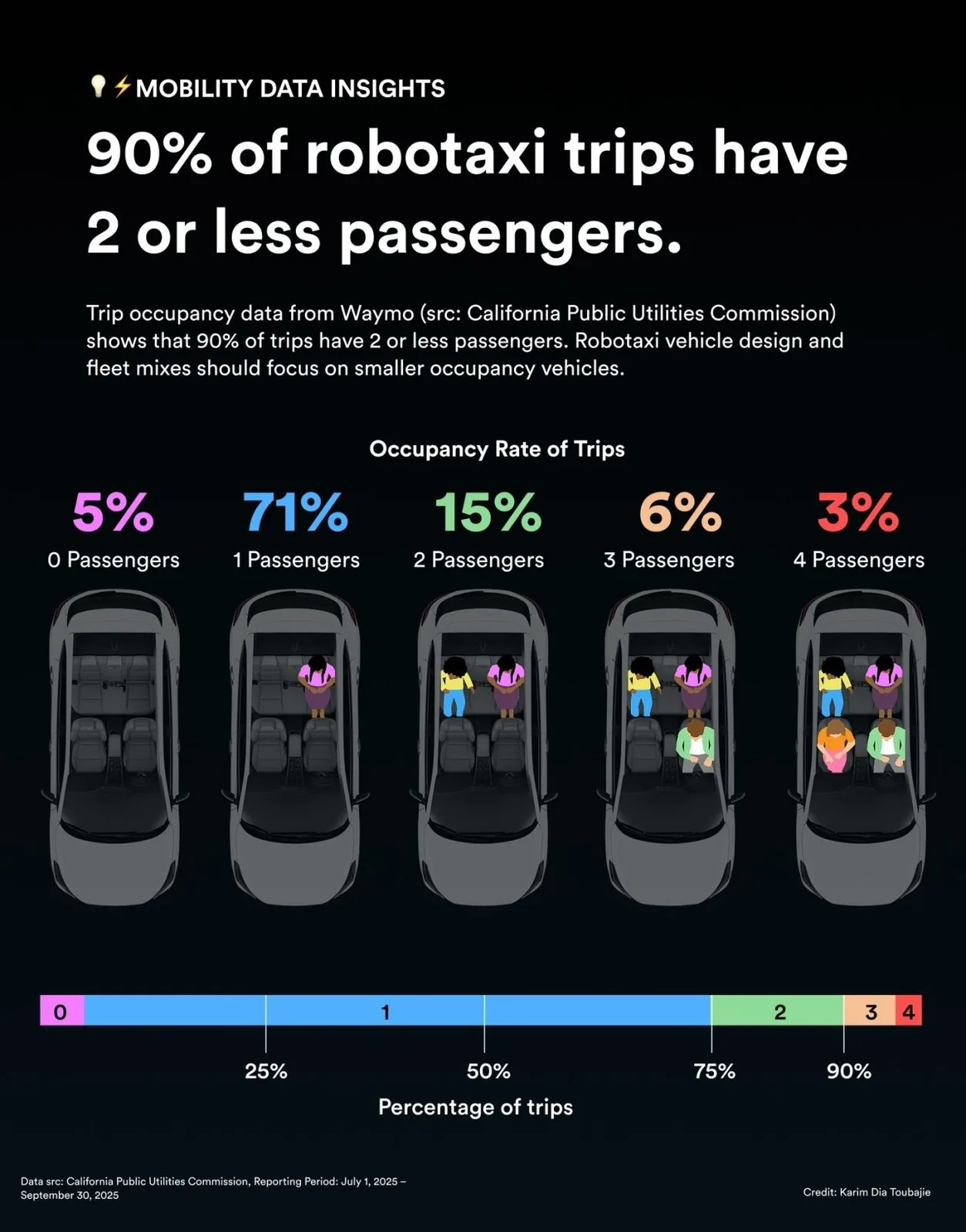 El concepto biplaza ha sido ahora reivindicado por las últimas estadísticas sobre las tasas de ocupación de Waymo. Resulta que el 90% de los viajes sin conductor realizados en un robotaxi se hacen con una o dos personas. Además, la gran mayoría de ellos se realizan con una sola persona, mientras que sólo el 9% incluye al menos una persona en los asientos delanteros.