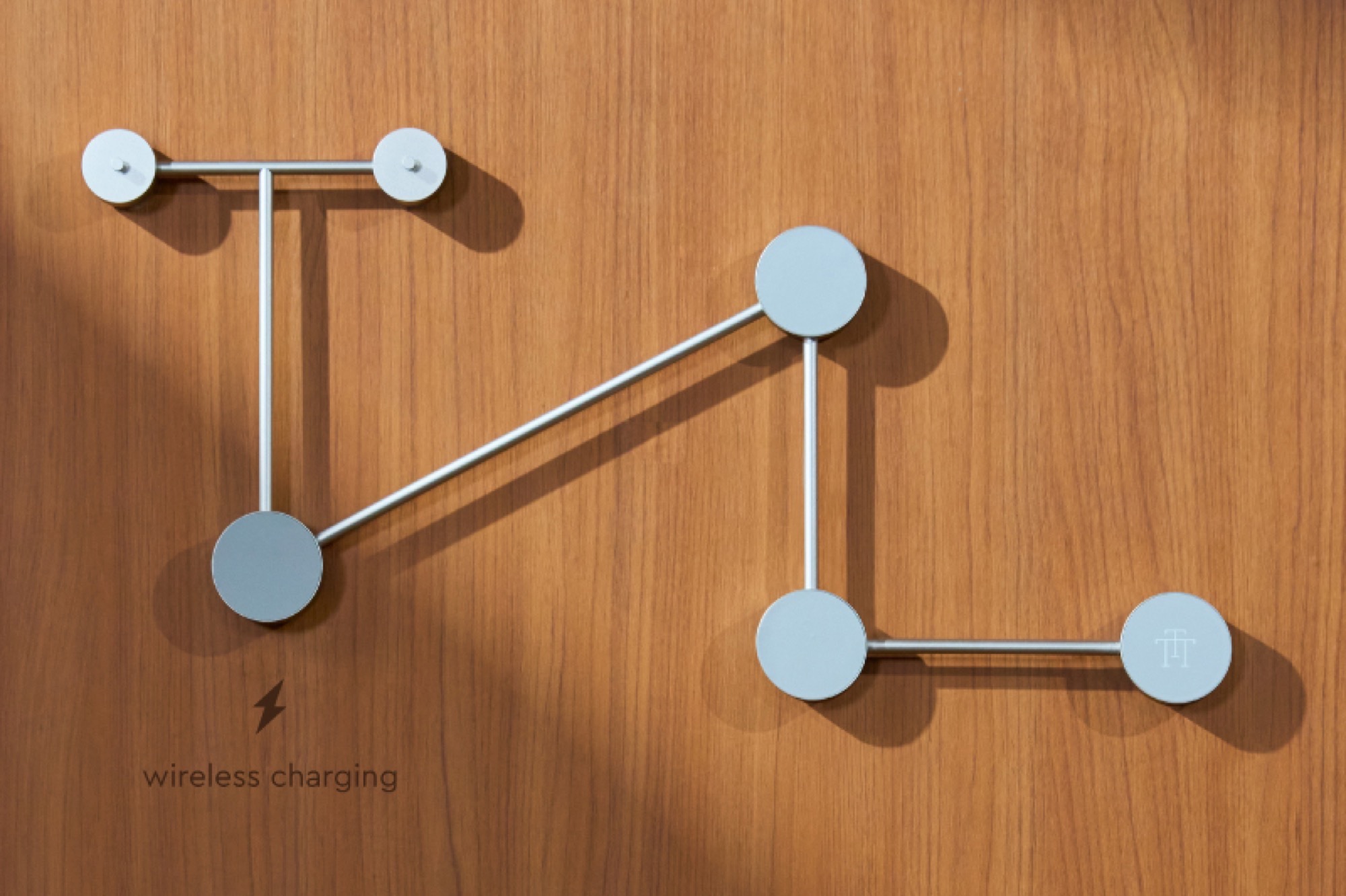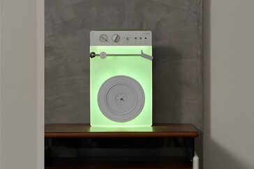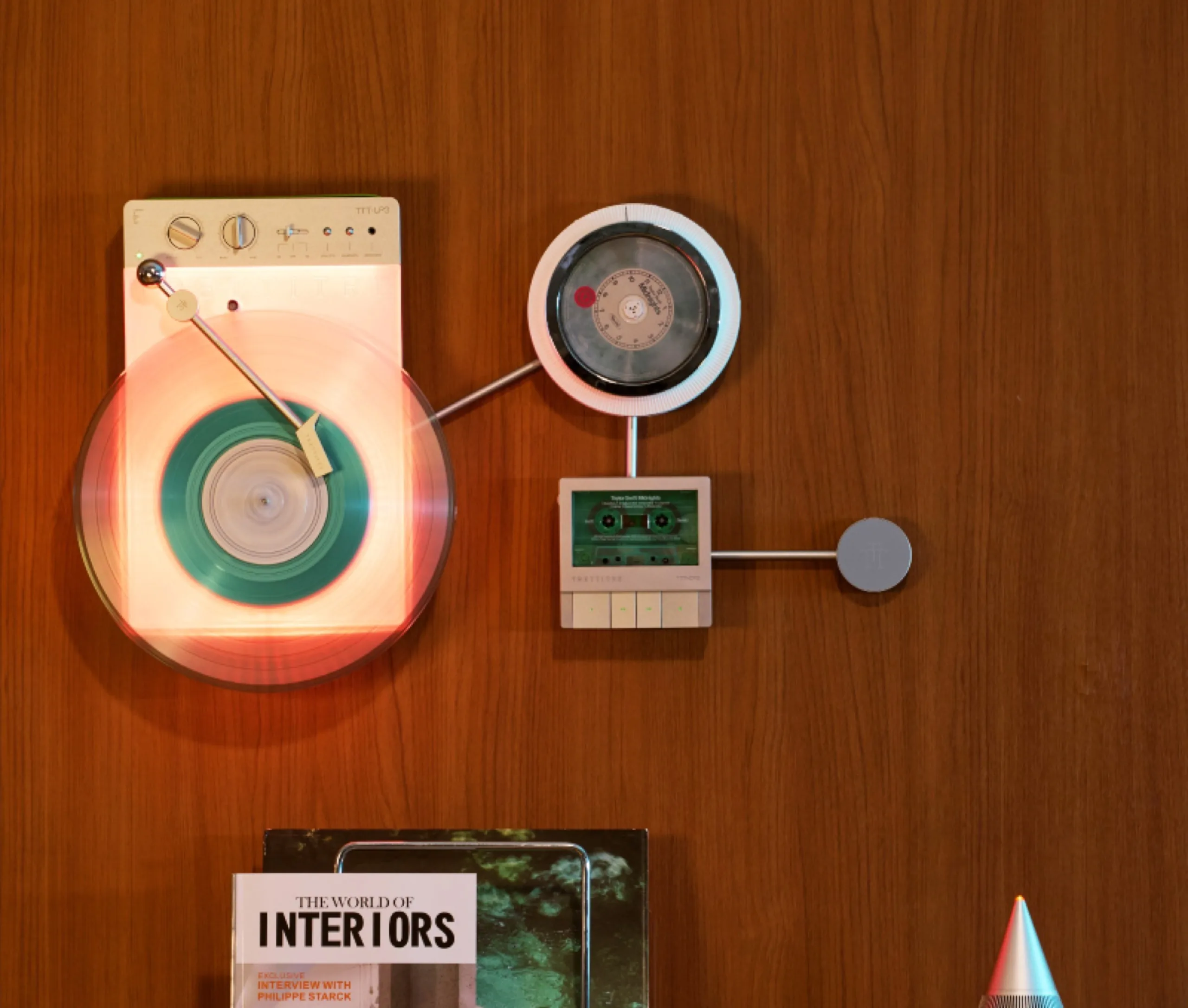 Este soporte de pared también puede sujetar magnéticamente un teléfono inteligente como el Apple iPhone 17. El sistema también consta de tres dispositivos de reproducción que pueden reproducir discos, CD y casetes compactos. El tocadiscos es el claro protagonista del diseño, ya que cuenta con una superficie iluminada que muestra hábilmente los vinilos