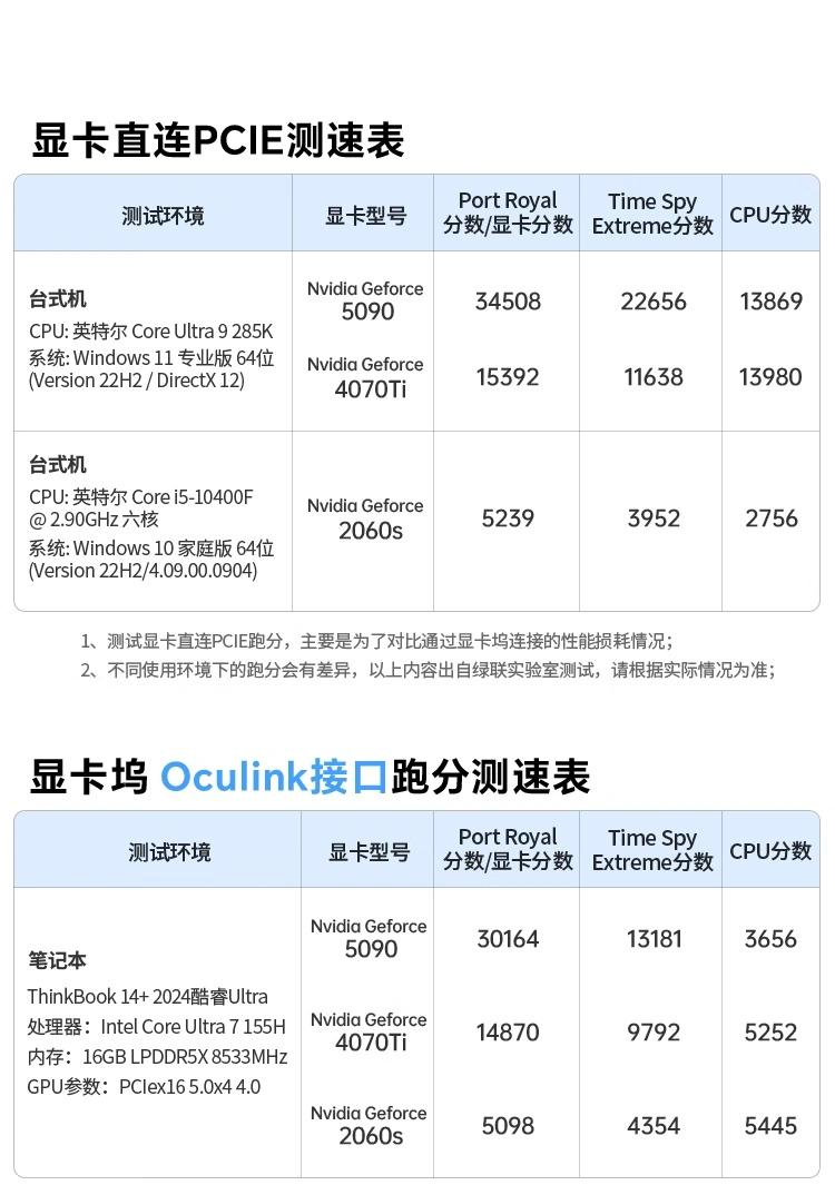 UGREEN compartió datos de pruebas comparativas para demostrar cómo se compara la base con la configuración tradicional de un ordenador de sobremesa. Una tarjeta gráfica RTX 5090 obtuvo 34.508 puntos en una prueba Port Royal en un ordenador de sobremesa, mientras que la misma tarjeta conectada a un portátil a través del puerto Oculink de la LinkStation obtuvo 30.164 puntos. Este resultado indica que, aunque una conexión directa a la placa base sigue siendo más rápida, la conexión Oculink es capaz de mantener un alto nivel de rendimiento para configuraciones externas.