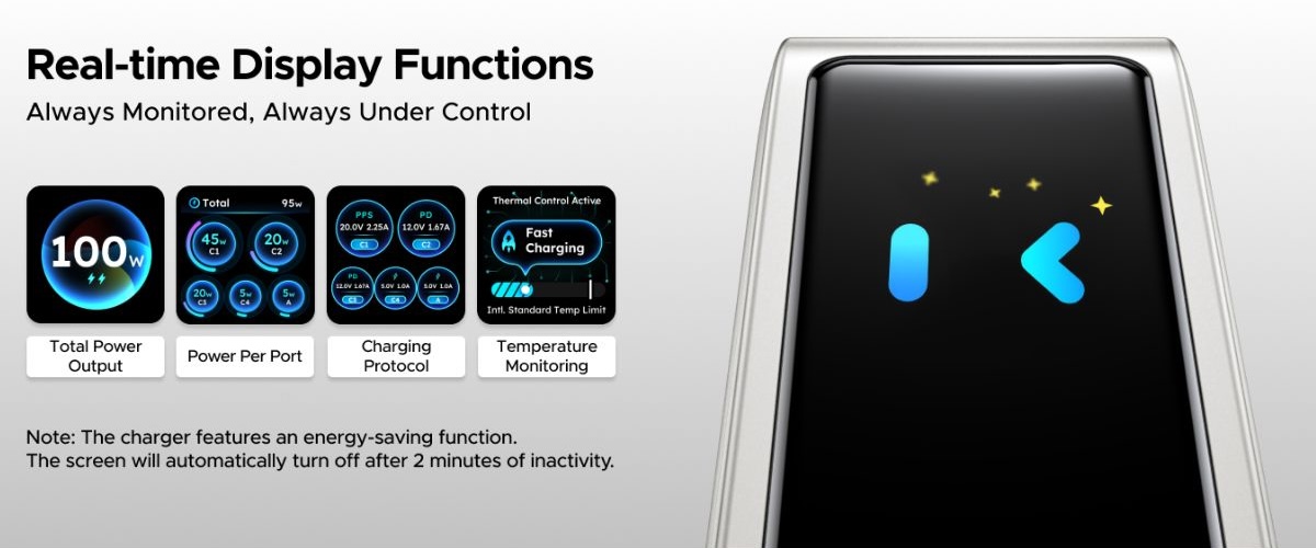 El cargador Nexode Pro 100W es compatible con diversos protocolos, como PD 3.0, QC 4.0 y PPS. En la pantalla integrada, los usuarios pueden ver la información de carga en tiempo real, como la distribución de la potencia, el protocolo o protocolos de carga y la temperatura. Además, este nuevo accesorio de Ugreen tiene un diseño plegable para hacerlo más compacto.