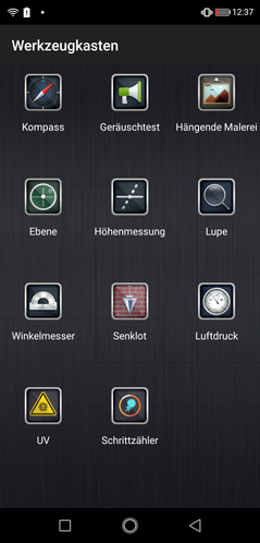 El fabricante incluye muchas de sus propias aplicaciones, como la caja de herramientas, que no sólo ofrece un nivel sino también aplicaciones para medir los rayos UV y determinar la altitud a través de la presión atmosférica. Las aplicaciones funcionan bien y contienen algunas formas inteligentes de, por ejemplo, determinar la altura de un objeto. Sin embargo, al igual que otras aplicaciones del fabricante, no siempre se traducen correctamente: Esto va desde instrucciones difíciles de entender hasta términos en inglés en la configuración (para dispositivos en idioma alemán).