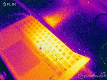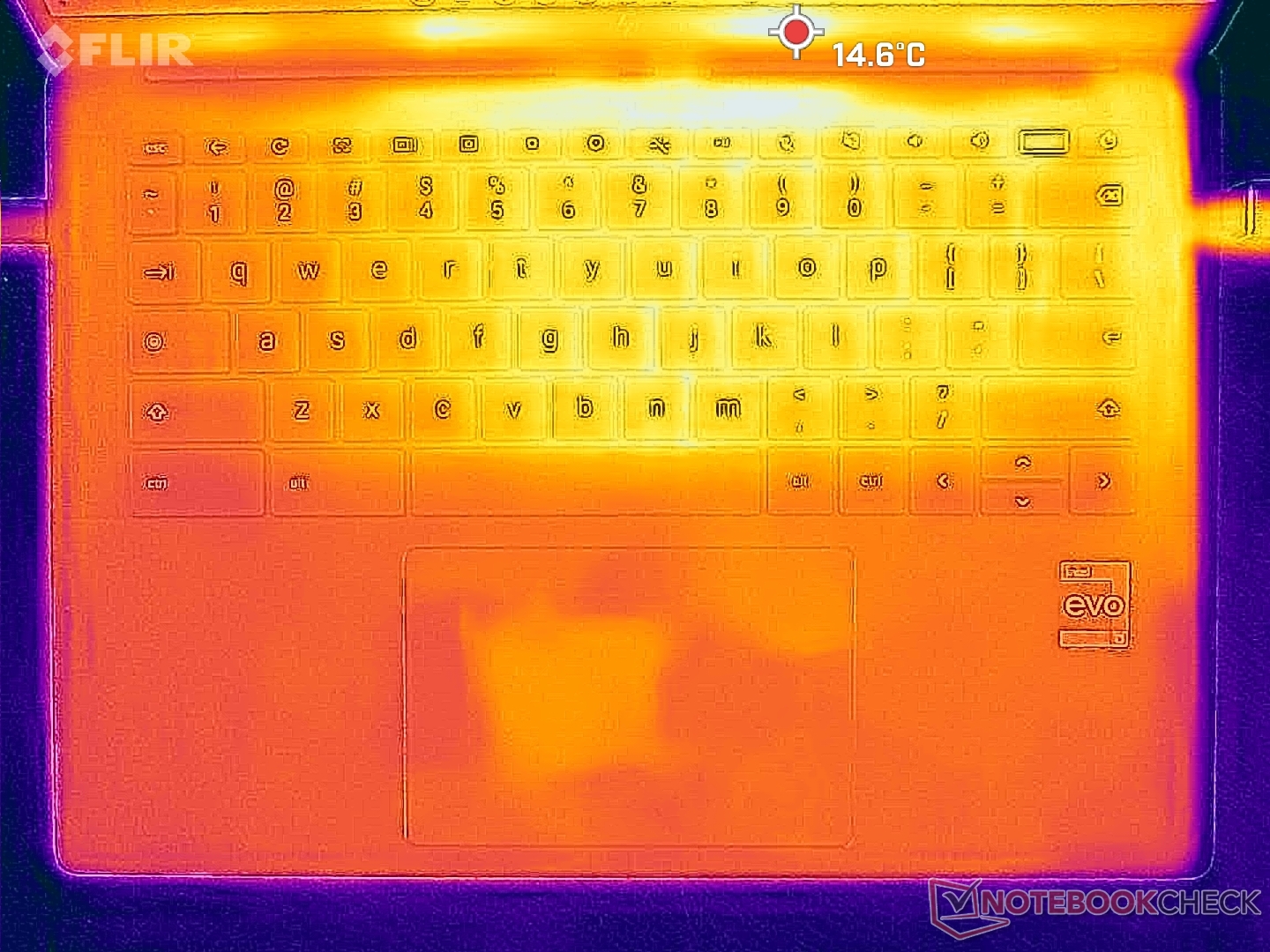 Las temperaturas medias son más cálidas que en la mayoría de los Chromebooks, probablemente debido a la construcción más ajustada del HP. Por ejemplo, la esquina del teclado puede ser de hasta 35 C en comparación con 31 C en el Asus Chromebook Flip CX5. Afortunadamente, las temperaturas nunca llegan a ser incómodamente cálidas. Algunos Chromebooks pueden funcionar incluso más calientes como elDell Latitude 7410 Chromebook.