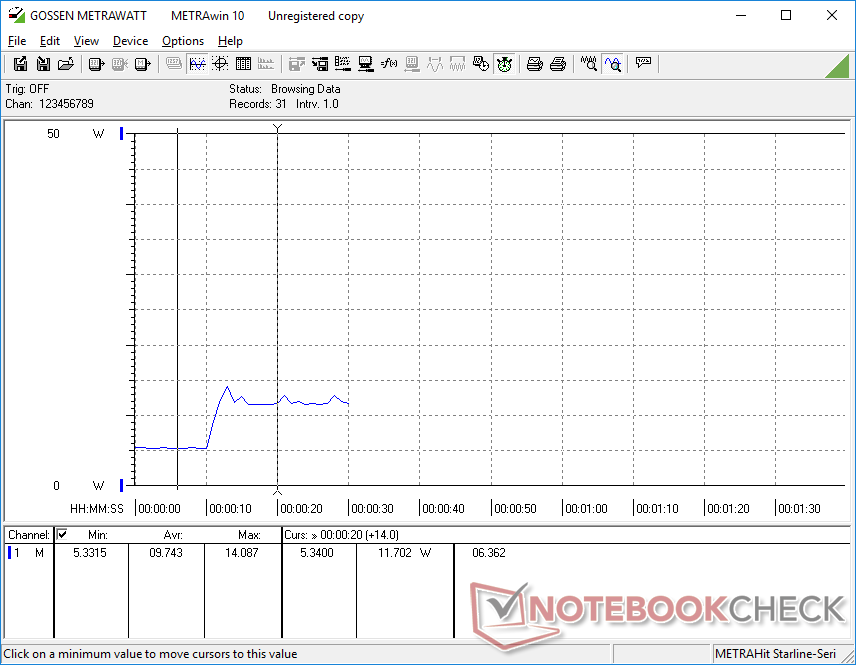 El consumo de energía al ejecutar Asphalt 8 en el ajuste de brillo máximo es de alrededor de 19 W, que es de nuevo más alto que en la mayoría de los Chromebooks. Para un escenario más extremo, podemos medir un consumo máximo de 69 W cuando la CPU está al 100% de utilización. Esta tasa es sólo temporal, sin embargo, ya que el rendimiento Turbo Boost no es indefinido.