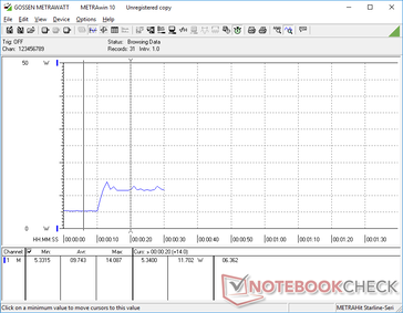 Aunque el sistema es en general muy eficiente como cabe esperar de cualquier Chromebook, el consumo de energía puede llegar a ser bastante alto debido a la pantalla superbrillante. La diferencia entre los ajustes de brillo mínimo y máximo puede ser de hasta 8 W en comparación con sólo 2 W o 4 W en la mayoría de los Chromebooks incluyendo los más grandes Lenovo IdeaPad Gaming Chromebook 16. Esto puede tener un profundo efecto en la duración de la batería como se mostrará en la siguiente sección.