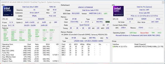 | Lenovo ThinkPad T1g Gen 8 21TD003GE Intel Core Ultra 9 285H ⎘ NVIDIA GeForce RTX 5070 Laptop ⎘ 64 GB Memoría, 2048 GB SSD | Precio de catálogo: 4500€ | 1.9 kg | 15.8 mm | 16.00" 3200x2000 236 PPI Tandem-OLED | |