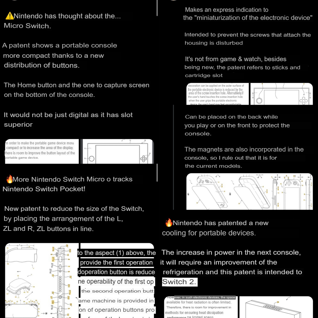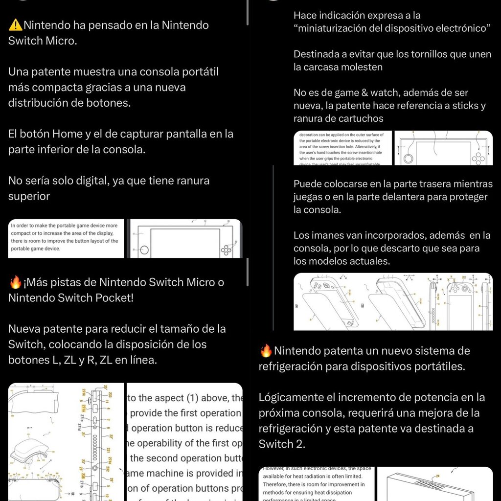 La información encontrada en las patentes ha hecho presumir que se está trabajando en una consola portátil Nintendo Switch Mini, Switch Pocket o Switch Micro. Una se centra en la redistribución de los botones, con el botón de inicio y el de captura desplazados a la parte inferior del dispositivo. Otra patente de https://twitter.com/NWeedle/status/1727446779430408346 va más allá con el movimiento de los botones, colocando los botones L, ZL, R y ZR en una línea. Aparentemente, haciendo cualquiera de esas cosas se conseguiría una consola Switch más compacta (el modelo de tamaño normal cuesta actualmente 290 dólares en Amazon).