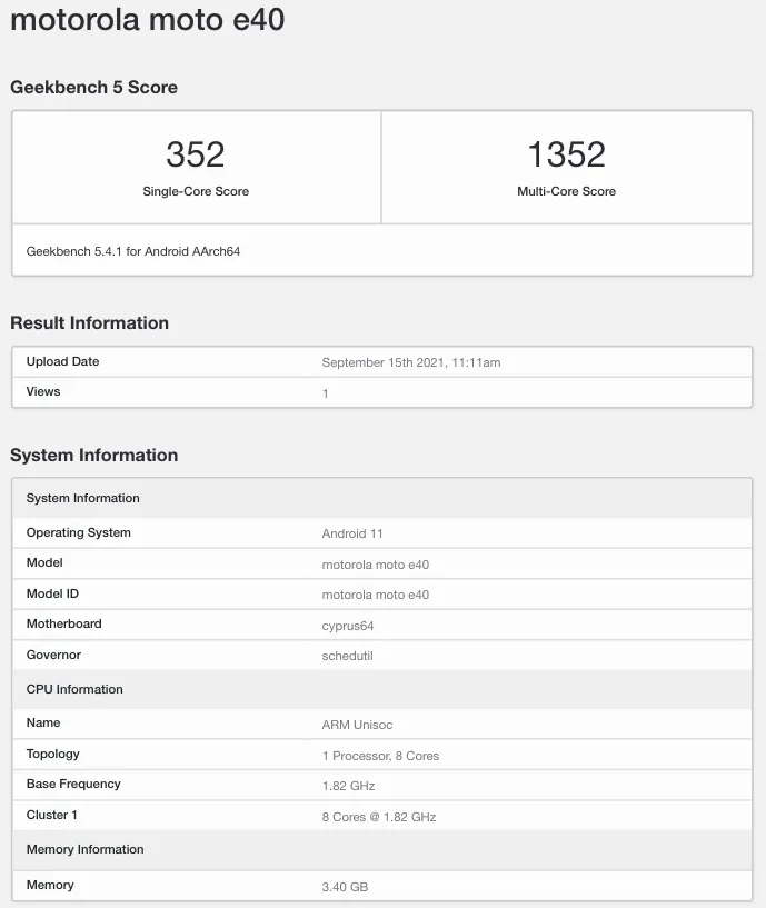 Este es el único "Moto Ex0" que no se había previsto hasta ahora; por otra parte, su nuevo avistamiento podría servir para demostrar que se trata simplemente de una versión más potente del "Moto E30". El E40 ha sido evaluado por https://browser.geekbench.com/v5/cpu/9839054 que tiene ciertas especificaciones importantes en común con su rumoreado teléfono compañero.