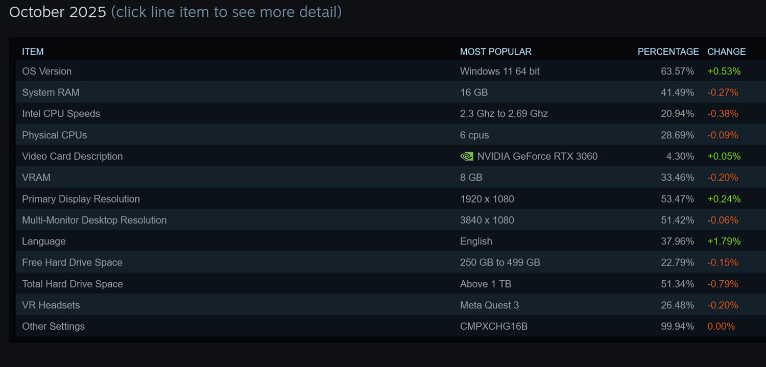 Aldehayyat hizo sus comentarios durante un podcast reciente de Adam Savage's Tested. Los datos de hardware rastreados por Valve parecen validar sus afirmaciones. Una de las preocupaciones de los compradores es con los 8 GB de VRAM de la GPU semipersonalizada AMD RDNA 3 de la Steam Machine. Sin embargo, con un 33,46% en la encuesta de octubre de https://store.steampowered.com/hwsurvey/esa capacidad de memoria coincide con la configuración más habitual.